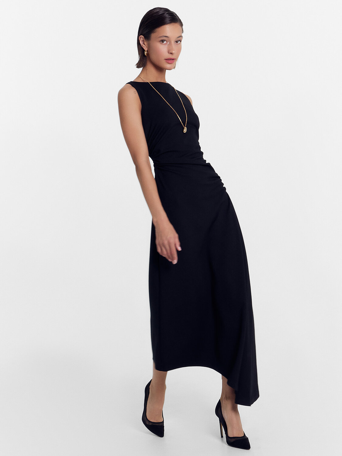 Платье асимметричное. В правом боковом шве сборка на верхней части.