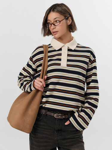 Поло прямое, свободное. Рукава втачные длинные, плечо спущено. Перед с застежкой "поло". Верхняя планка отрезная. Застежка на 3 петли и пуговицы (D 10мм). Воротник из основного полотна. Шов втачивания воротника закрыт бейкой из основного полотна. Низ поло и рукавов обработан швом вподгибку.