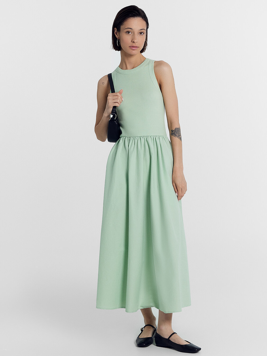 К низу сарафан расширяется, длина миди.