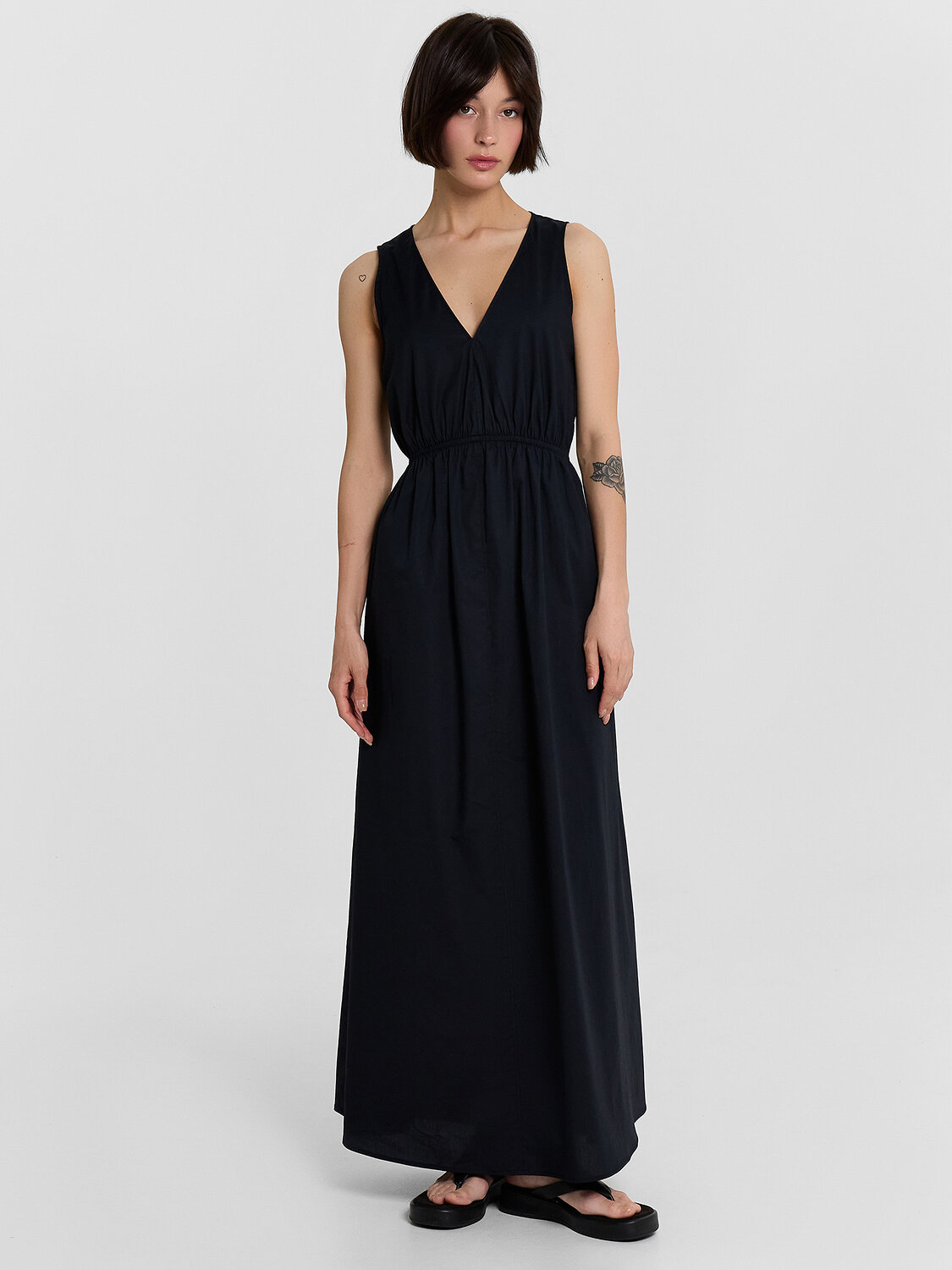 Сарафан расширяется к низу, длина сарафана миди.