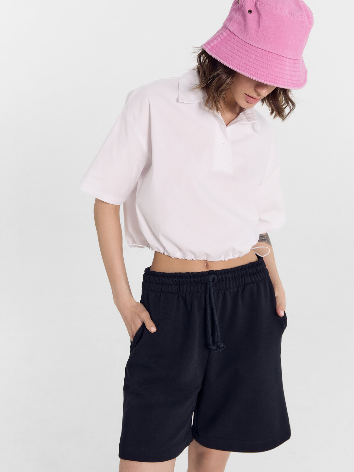 Короткие свободные шорты с высокой линией талии. Изготовлены из трикотажного футера. Пояс – с эластичной тесьмой внутри и шнуром-завязкой. Есть удобные карманы. Стильно!