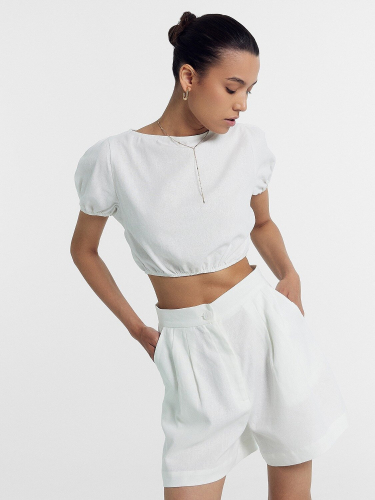 Верхний срез обработан отрезным поясом из основного полотна. Центральная застежка на молнию и пуговицу. Пуговица. На передних половинках обработаны косые карманы от пояса к боковым швам с отрезным бочком. По верхнему срезу заложены по две односторонние складки.