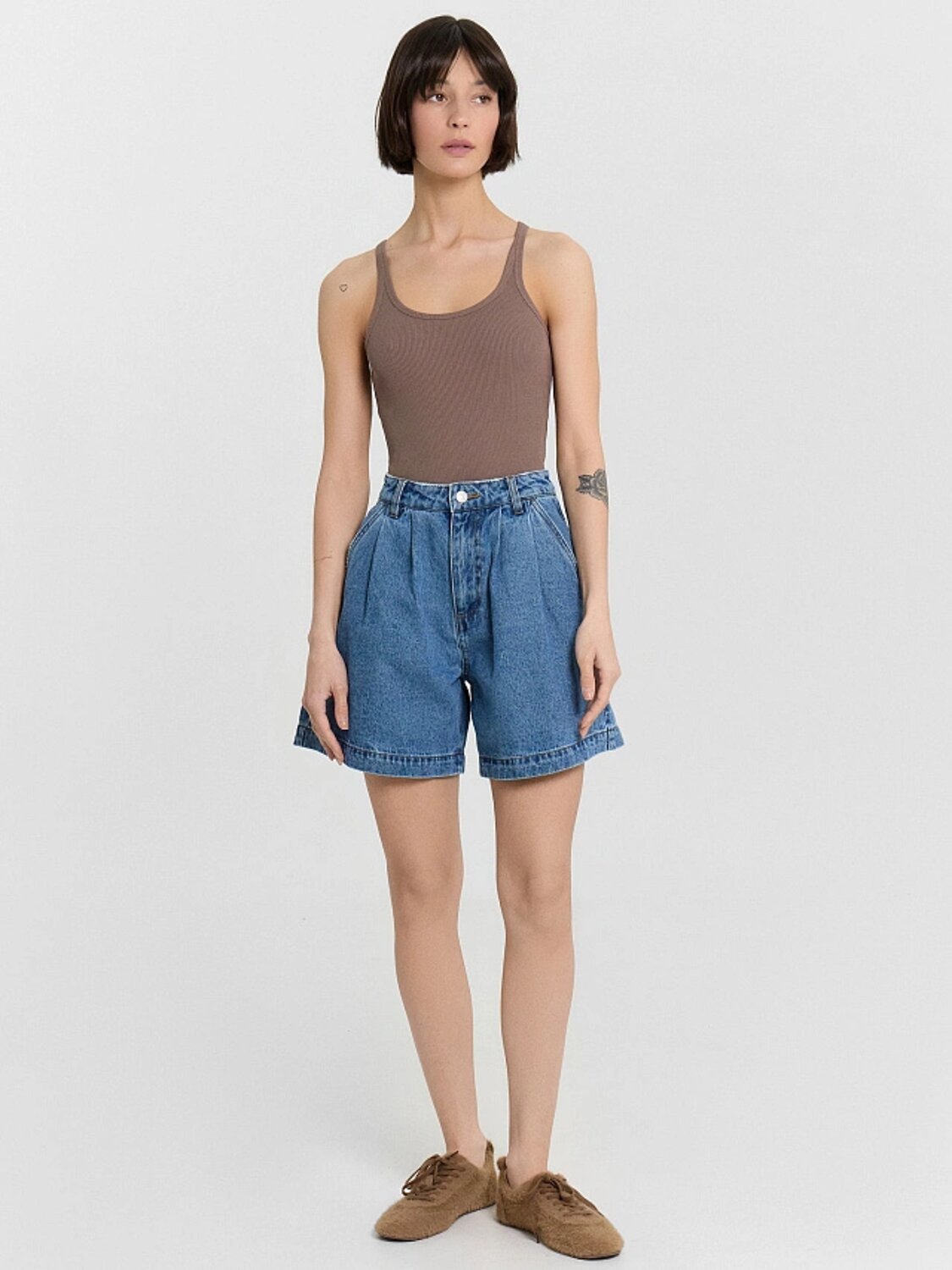 Женские джинсовые шорты трапециевидной формы — это стильная и универсальная модель, идеально подходящая для теплого сезона. Благодаря силуэту, расширяющемуся к низу, шорты подчеркивают талию и визуально вытягивают ноги, создавая легкий и женственный образ. Изделие выполнено из натурального хлопка, что обеспечивает отличную воздухопроницаемость, комфорт и износостойкость. Застежка на молнию и пуговицу делает посадку надежной, а боковые карманы и петли для ремня добавляют функциональности и позволяют варьировать стиль с помощью аксессуаров. Такая модель легко сочетается с топами, футболками или рубашками, позволяя создавать как повседневные, так и более выразительные образы.