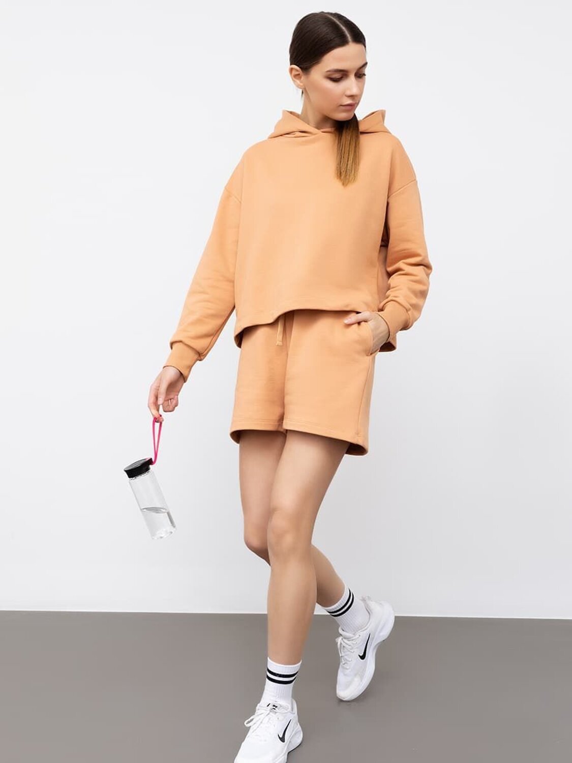 Мини-шорты свободного силуэта из легкого трикотажного футера. Высокая посадка на талии, эластичная тесьма в поясе, регулировочный шнурок-завязка и удобные боковые карманы – комфортный минимализм!