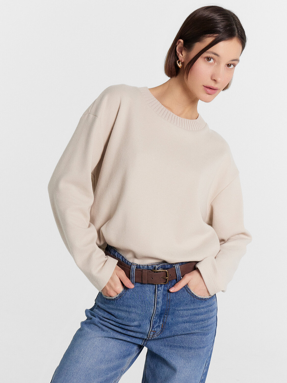 Свитшот свободный, укороченный. Горловина круглой формы, обработана обтачкой из довяза 3*3 (DOC40/195-0/4). Перед цельнокроеный, спинка со средним швом. Рукава втачные длинные, плечо спущено. Нижние срезы обработаны швом вподгибку.