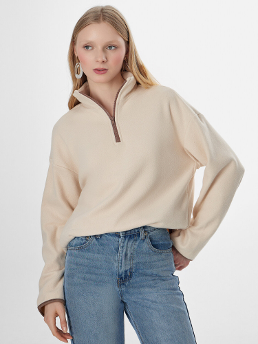 Женская толстовка из мягкого флиса станет уютным дополнением вашего гардероба. Свободный крой с круглой горловиной и стойкой обеспечивает комфорт в течение всего дня. Застежка-молния по центру и мягкие спущенные плечи создают расслабленный силуэт, не сковывающий движений.