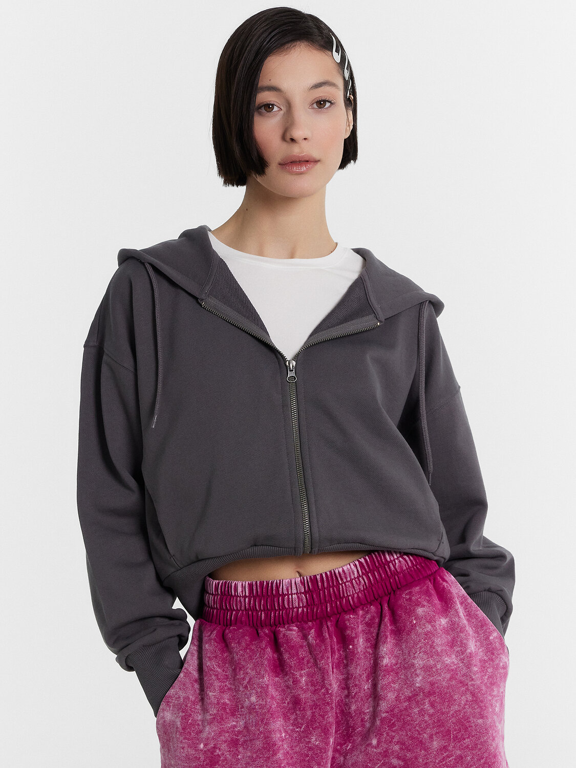 Укороченная женская толстовка – стильный и удобный выбор для вашего гардероба. Капюшон на кулиске обеспечивает защиту от ветра, а центральная застежка на молнию позволяет легко надевать и снимать изделие. Длинные рукава с эластичными манжетами из рибаны удерживают тепло и обеспечивают комфорт, в то время как спущенная линия плеча придает стильный и расслабленный вид. Боковые карманы добавляют функциональности, позволяя хранить мелкие вещи. Выполненная из футера без подчеса, толстовка отличается мягкостью и долговечностью, обеспечивая комфорт при носке. Она идеально подойдет для создания повседневных и спортивных образов, легко сочетаясь с различными элементами гардероба.