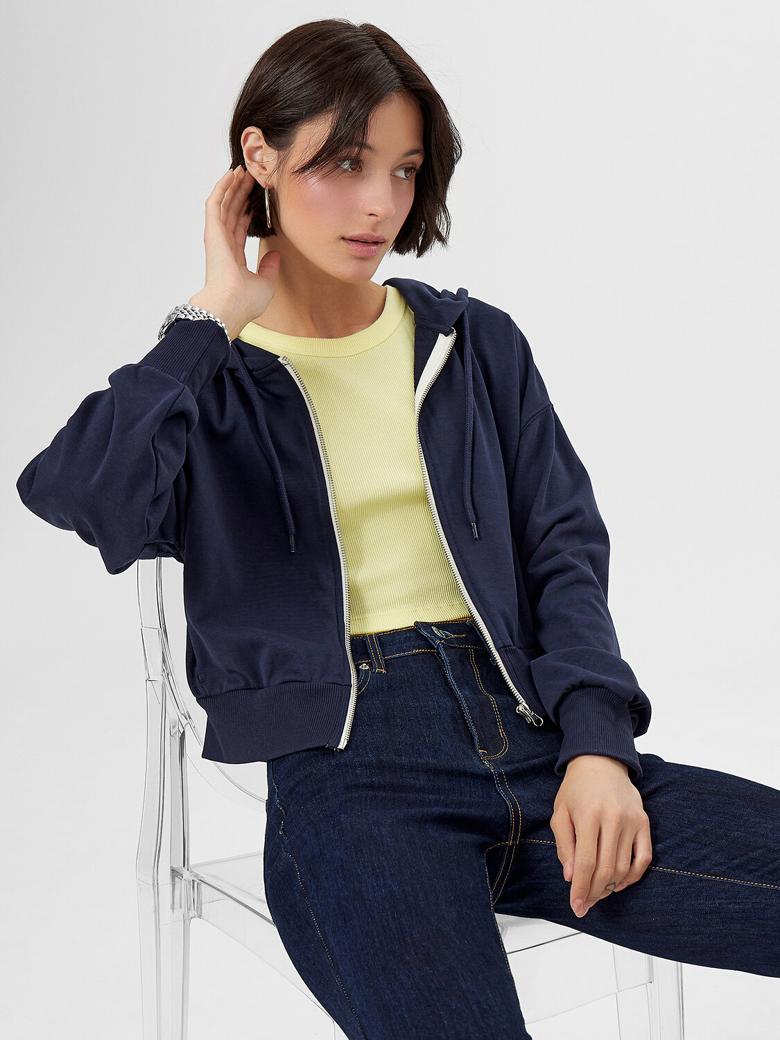 Толстовка свободного силуэта, укороченная. Горловина круглой формы с капюшоном. Капюшон цельнокроеный с подкладкой. На внешней стороне капюшона пробиты петли и вставлен шнур 8мм с эглетами (8EКXWCp-1). Шов втачивания капюшона закрыт бейкой из кулирки. Центральная застежка на тесьму-молнию. Рукава втачные длинные с отрезными манжетами из рибаны. Плечо спущено. На деталях переда вертикальные рельефы. В рельефах обработаны карманы. Подкладка кулирка. По низу отрезной пояс из рибаны.