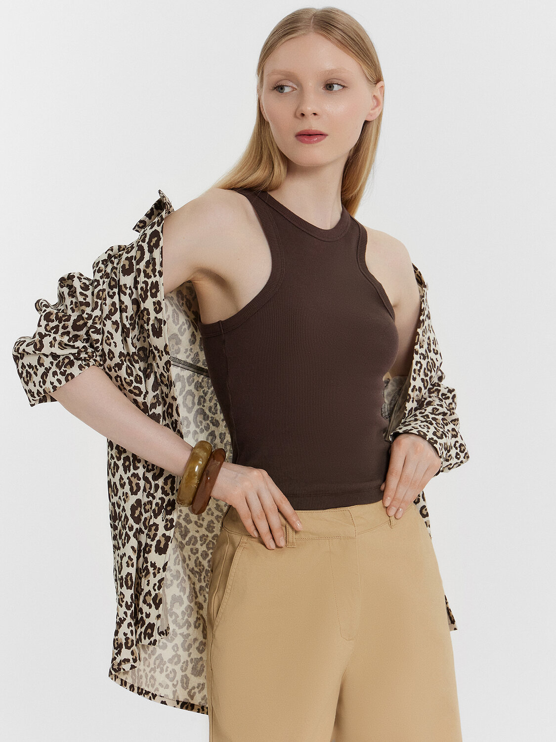 Нижний срез топа обработан швом вподгибку на 2х иглольной плоскошовной машине.