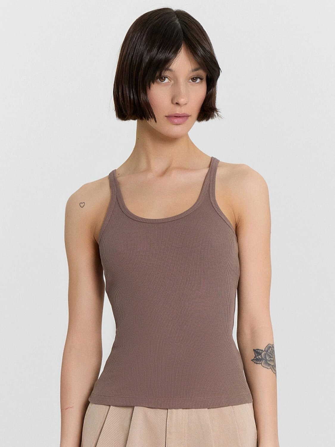Женский топ прилегающего силуэта — стильный и комфортный элемент гардероба, который подчеркивает женственность и элегантность. Модель выполнена из трикотажной рибаны — мягкого и эластичного материала, который обеспечивает удобную посадку, адаптируясь к движениям тела. Округлая горловина придает классический акцент, а тонкие бретели создают легкий и изящный образ, красиво акцентируя линию плеч и декольте. Срезы горловины и проймы окантованы бейками из основного полотна, что обеспечивает аккуратный вид и дополнительную прочность. Топ отлично сочетается с разными элементами одежды, позволяя создавать стильные образы — от повседневных до более элегантных и вечерних. Идеальный выбор для тех, кто ценит комфорт, женственность и утонченный стиль!