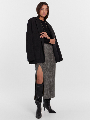 Юбка прямая, длина миди. Верхний срез обработан швом вподгибку с эластичной тесьмой внутри ( 40мм 40RV внутр.). На передней и задней детали проложена строчка по среднему шву. На задней детали в среднем шве обработан разрез. Нижний срез обработан швом вподгибку. Усилитель разреза- Лента репсовая шир.7мм, SFLR-2 .