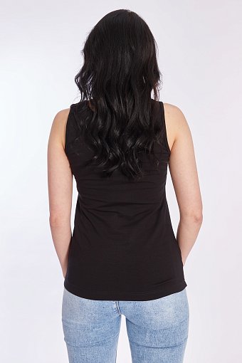 Майка выполнена из хлопкового полотна с лайкрой. Украшает майку горизонтальная вставка из кружева. Вырез каре.