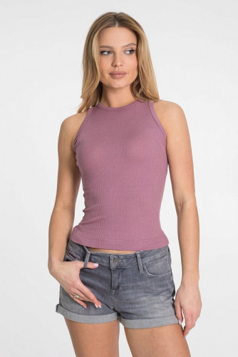 Майка женская на широких бретелях, с круглым вырезом горловины. Силуэт облегающий, майка выполнена из полотна в рубчик (кашкорсе-вискоза), спереди планка на кнопках.