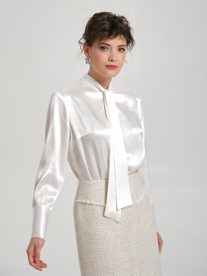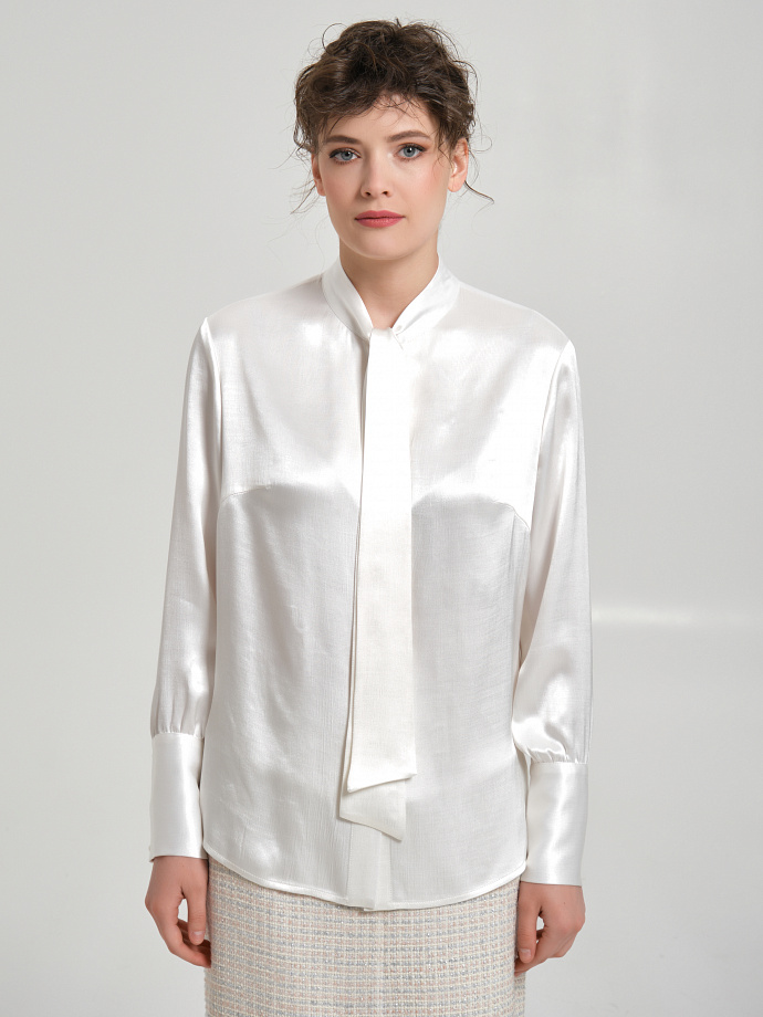 Модель прямого силуэта, с застёжкой на петли и пуговицы. Спереди воротник стойка переходит в бант. По низу рукава разрез, сборка и манжета с застёжкой на пуговицы. В боковых швах разрезы. Низ блузки закруглён.