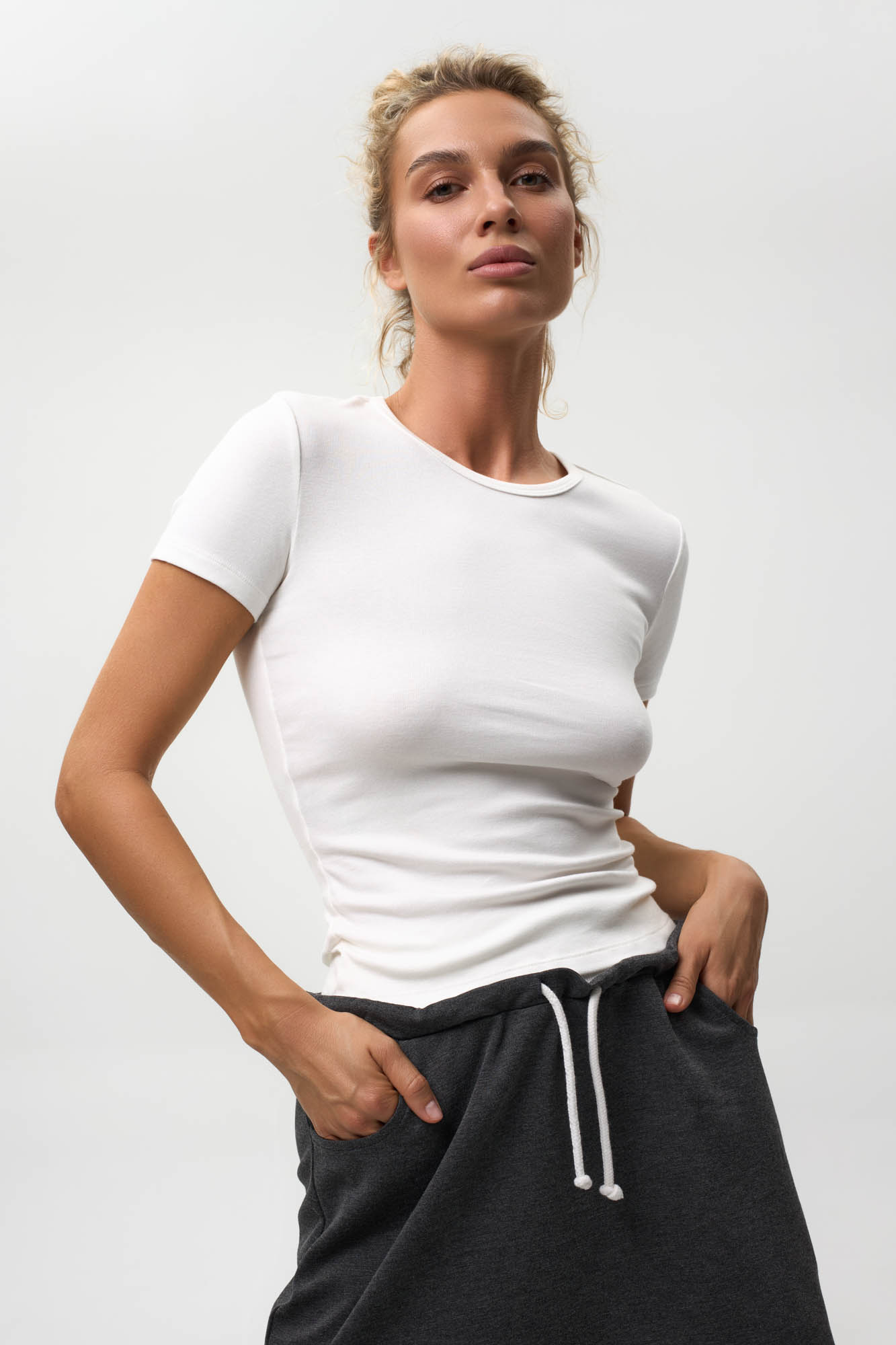 Футболка с коротким рукавом, прилегающего кроя с аккуратной горловиной.