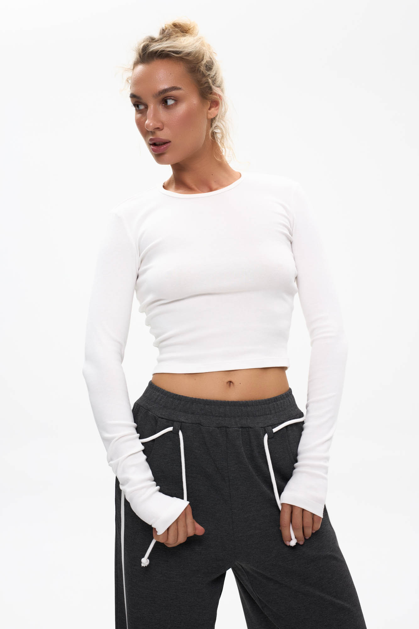 Лонгслив прилегающего кроя с аккуратной горловиной и удлиненным рукавом.