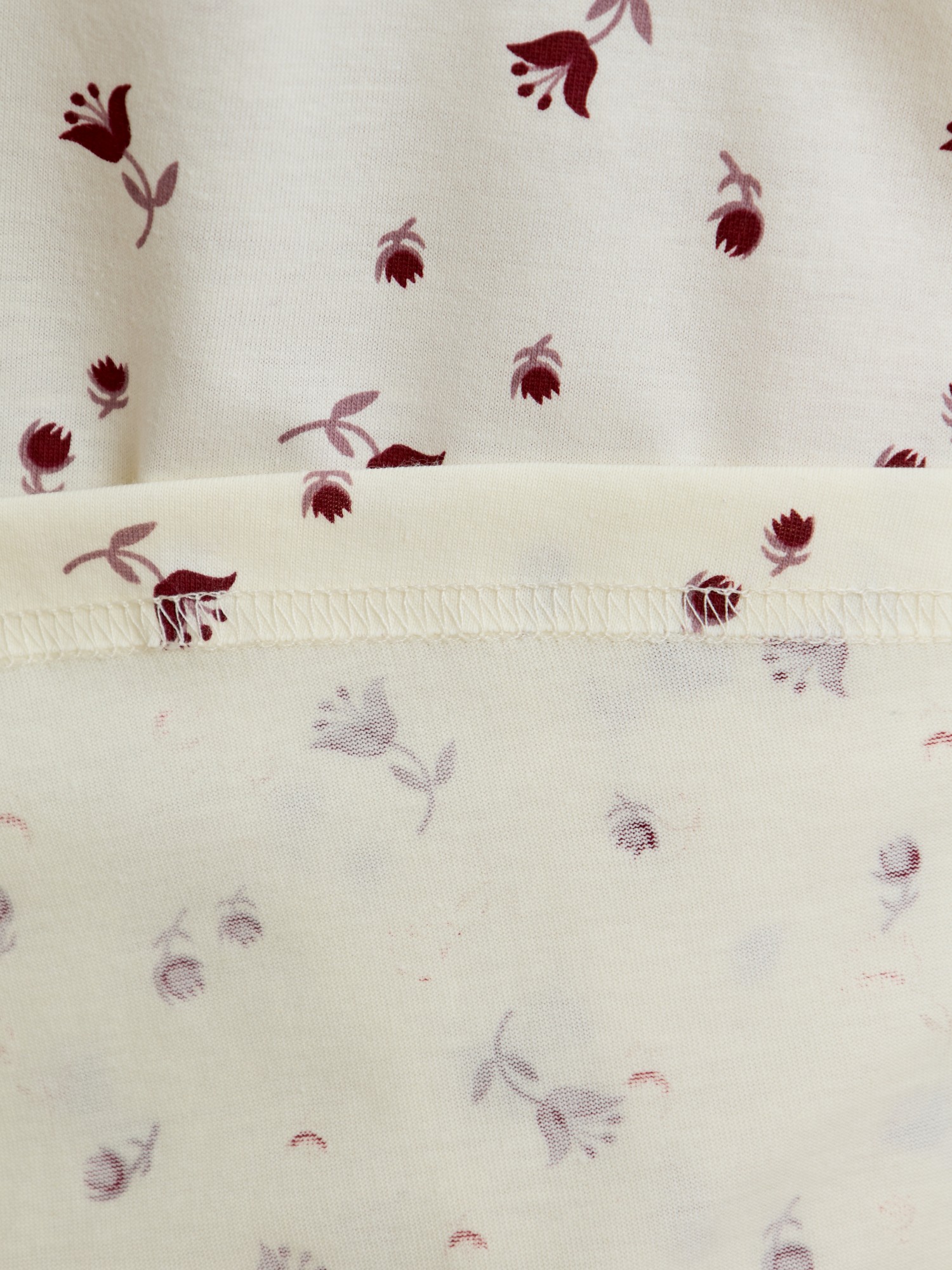Сорочка женская из трикотажного полотна «кулирка» с набивным рисунком, свободного кроя, слегка расширенная книзу, с короткими втачными рукавами. Полочка – с двойными кокетками, кружевом в шве соединения кокеток с основной деталью и декоративной вставкой «петлей» для достижения небольшого эффекта драпировки. Основная деталь переда присборена по шву притачивания кокетки.