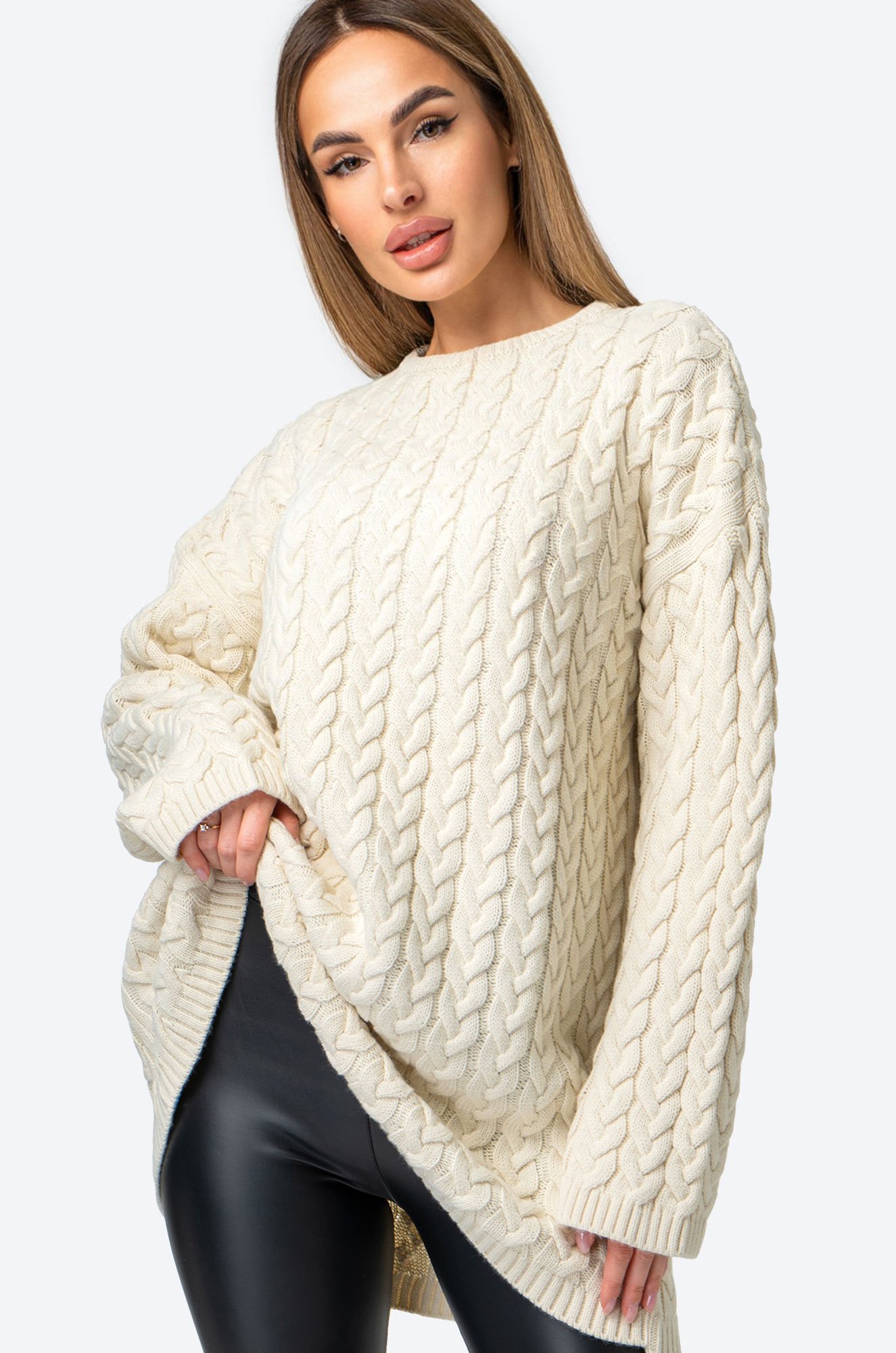 Окутывающий неж..показатьностью и заботой женский свитер молочного цвета выполнен из акрила и шерсти. Удлиненный силуэт, крой оверсайз, фактурная вязка коса, уютные широкие рукава – в этом джемпере для женщин есть все, что поможет оставаться стильной в любой ситуации!