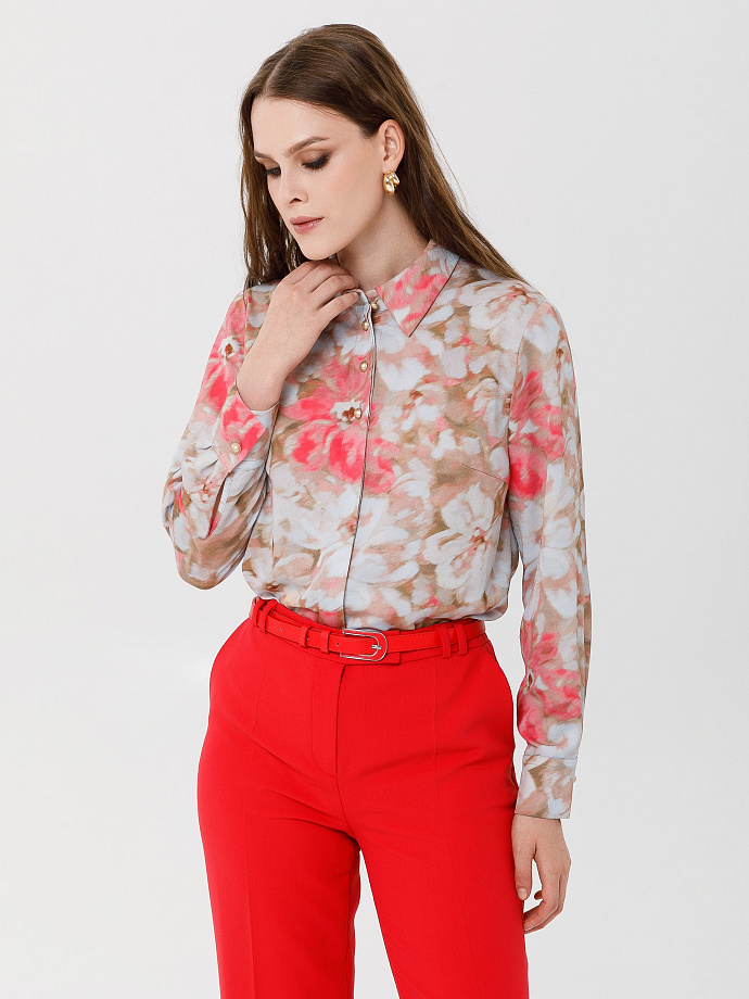 Модель прямого силуэта, со спущенным плечом и длинным рукавом. Спереди частично потайная застёжка на петли и пуговицы. Спинка с кокеткой, под кокеткой складка. Воротник сорочечный. По низу рукава разрез, защипы и манжета с застёжкой на пуговицу. В боковых швах небольшие разрезы.