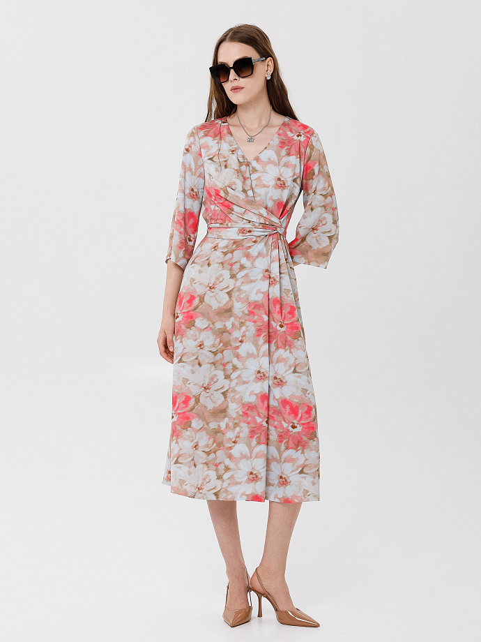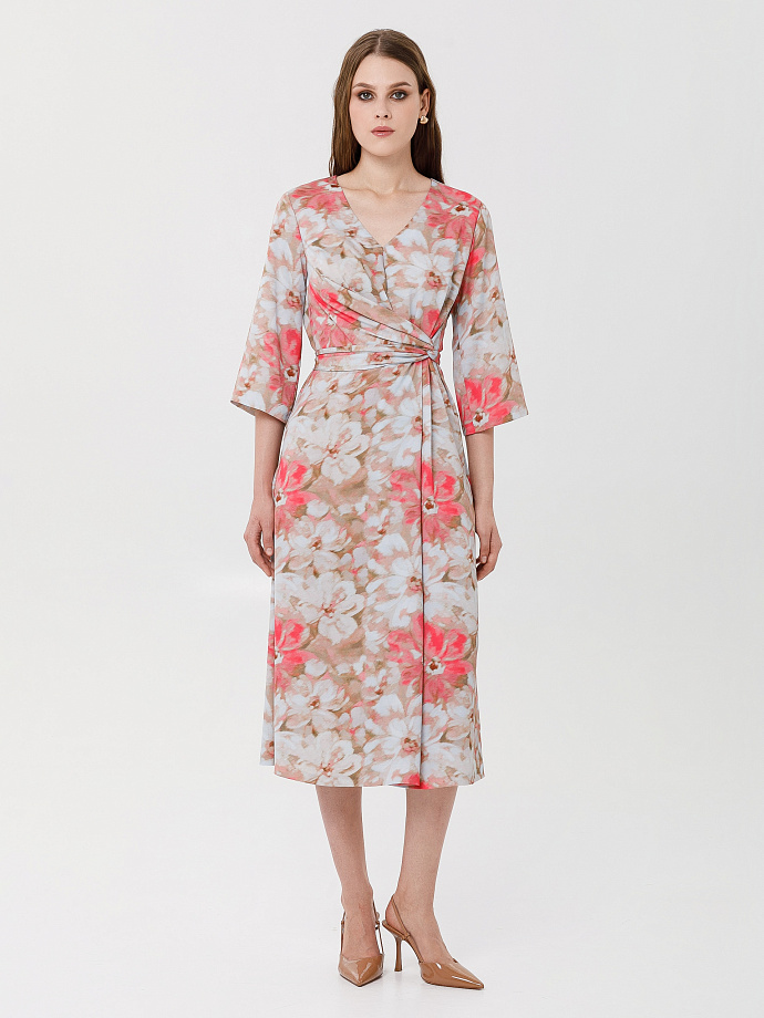 Модель А-образного силуэта, со спущенным плечом и рукавом 3/4. Перед ассиметричный, с имитацией запаха, драпировкой и средним швом. Правая часть с горизонтальным подрезом по талии. Талия подчёркнута завязывающимся поясом. Часть пояса цельнокроенная с верхней частью переда. Вторая часть пояса в боковом шве.