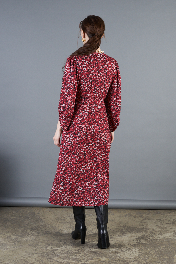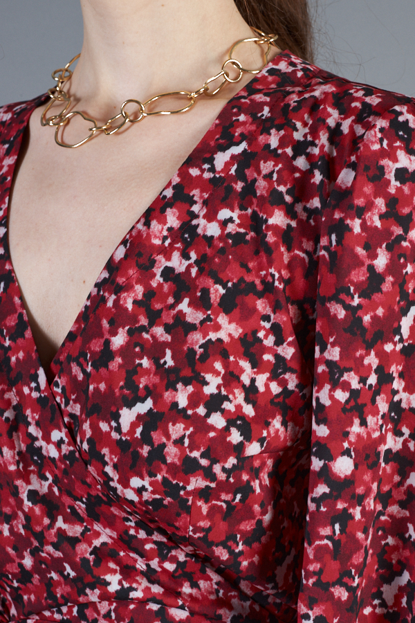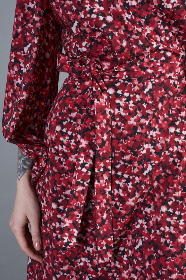 Платье с запахом фиксирующимся притачным поясом выполнено из плательной ткани. Отрезное в области талии. Лиф прилегающий. Юбка летящего силуэта. Фантазийные рукава с асимметричным низом, окантованным бейкой, и сборкой по окату и низу рукава.