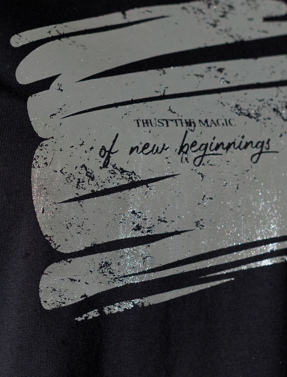 Стильная базовая футболка черного цвета с серебристым принтом фольгой выполнена из плотного хлопка с эластаном для комфортной посадки на любую фигуру. Прямая футболка классического кроя с круглым вырезом, прекрасно подходит для разных типов фигуры, в том числе и на большие размеры. Мягкость хлопка вместе с небольшой долей эластана гарантирует идеальную посадку и свободу движений. Легкая натуральная дышащая ткань премиального качества делает футболку с коротким рукавом идеальным вариантом для повседневной носки дома, на работу или офис. Однотонная футболка дополнена авторским аккуратным принтом с минималистичной надписью, который придает праздничный и элегантный вид без лишней вычурности. Блестящий принт аккуратно украшает, добавляя изысканный акцент и создавая легкий мерцающий эффект. Перевод надписи Trust the magic of new beginnings - Дооверьтесь магии новых начинаний.