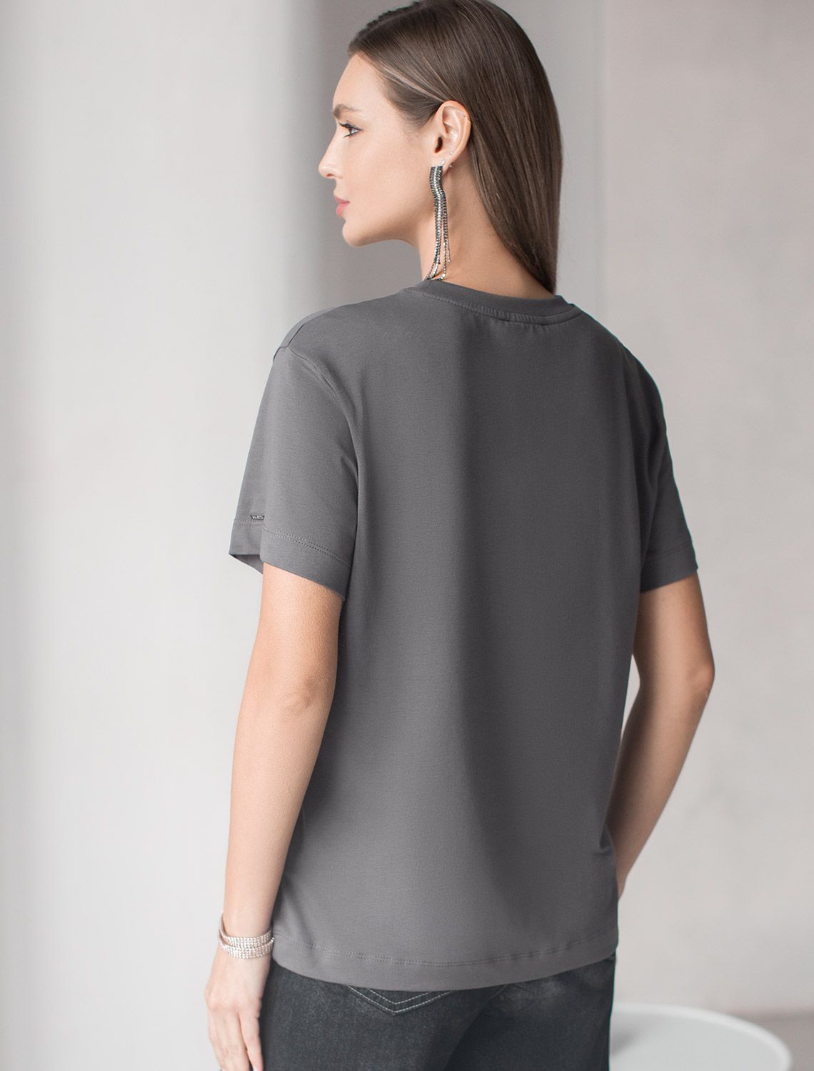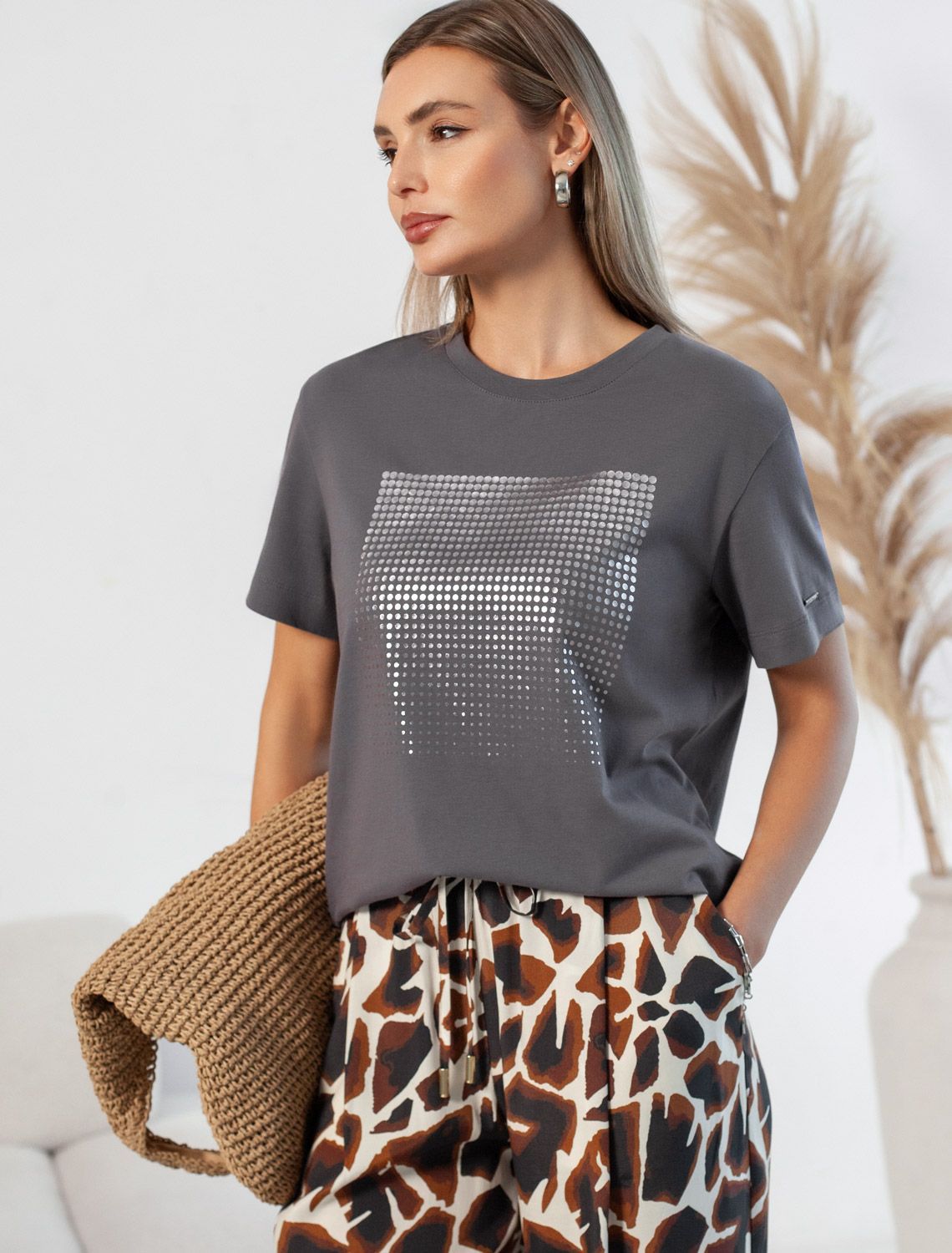 Стильная базовая футболка темно-серого цвета с серебристым принтом фольгой выполнена из плотного хлопка с эластаном для комфортной посадки на любую фигуру. Прямая футболка классического кроя с круглым вырезом, прекрасно подходит для разных типов фигуры, в том числе и на большие размеры. Мягкость хлопка вместе с небольшой долей эластана гарантирует идеальную посадку и свободу движений. Легкая натуральная дышащая ткань премиального качества делает футболку с коротким рукавом идеальным вариантом для повседневной носки дома, на работу или офис. Однотонная футболка дополнена авторским аккуратным принтом с минималистичной надписью, который придает праздничный и элегантный вид без лишней вычурности. Блестящий принт аккуратно украшает, добавляя изысканный акцент и создавая легкий мерцающий эффект.