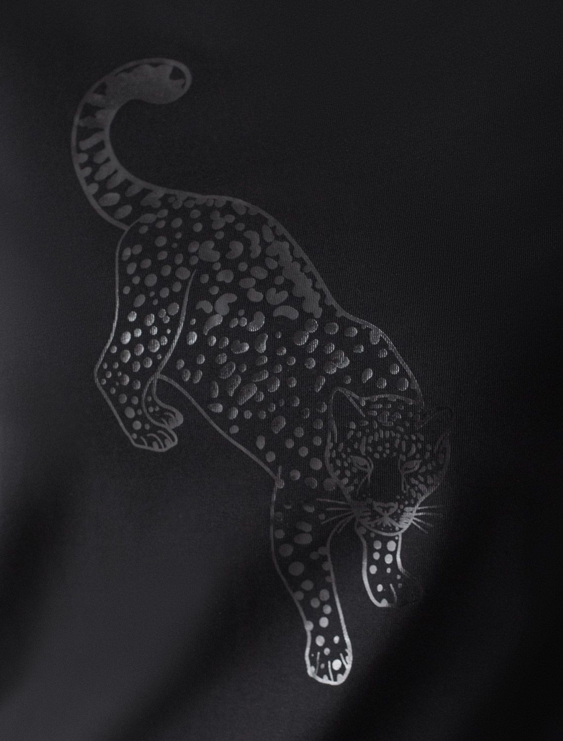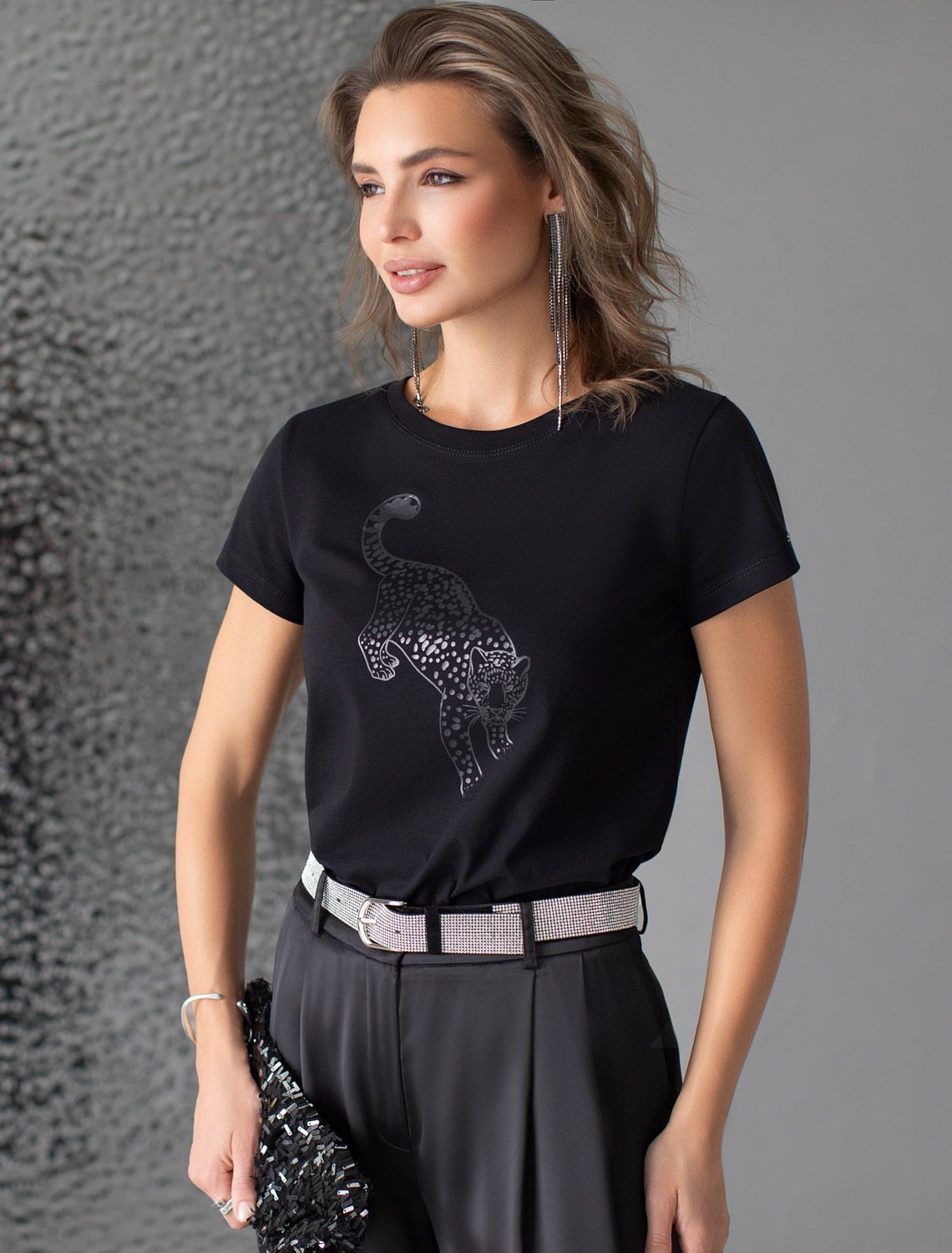 Стильная базовая футболка черного цвета с серебристым принтом устойчивыми красками выполнена из плотного хлопка с эластаном для комфортной посадки на любую фигуру. Прямая футболка классического кроя с круглым вырезом, прекрасно подходит для разных типов фигуры, в том числе и на большие размеры. Мягкость хлопка вместе с небольшой долей эластана гарантирует идеальную посадку и свободу движений. Легкая натуральная дышащая ткань премиального качества делает футболку с коротким рукавом идеальным вариантом для повседневной носки дома, на работу или офис. Однотонная футболка дополнена авторским аккуратным принтом с изображением леопарда, который придает праздничный и элегантный вид без лишней вычурности. Блестящий анималистичный принт аккуратно украшает, добавляя изысканный акцент и создавая легкий мерцающий эффект.