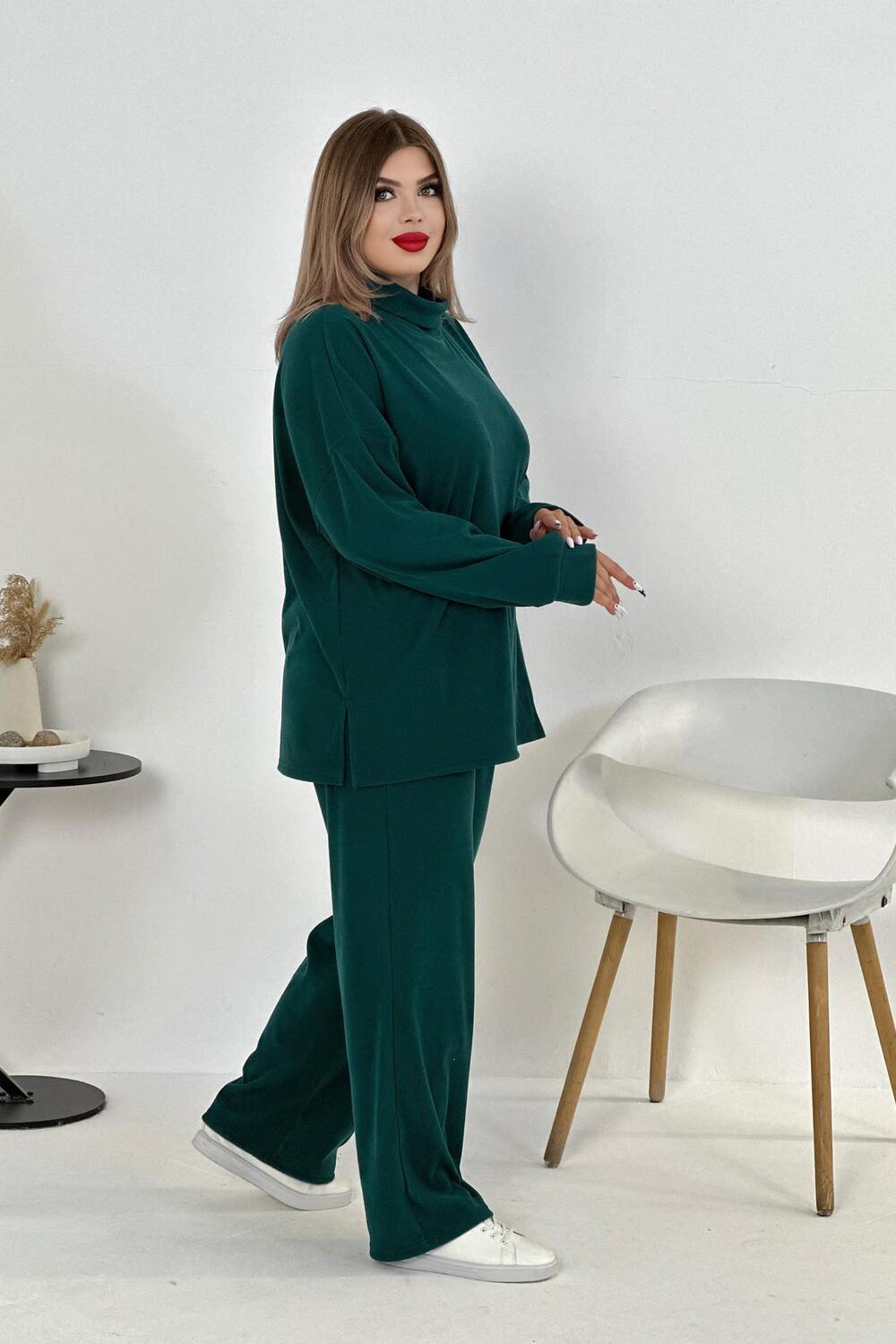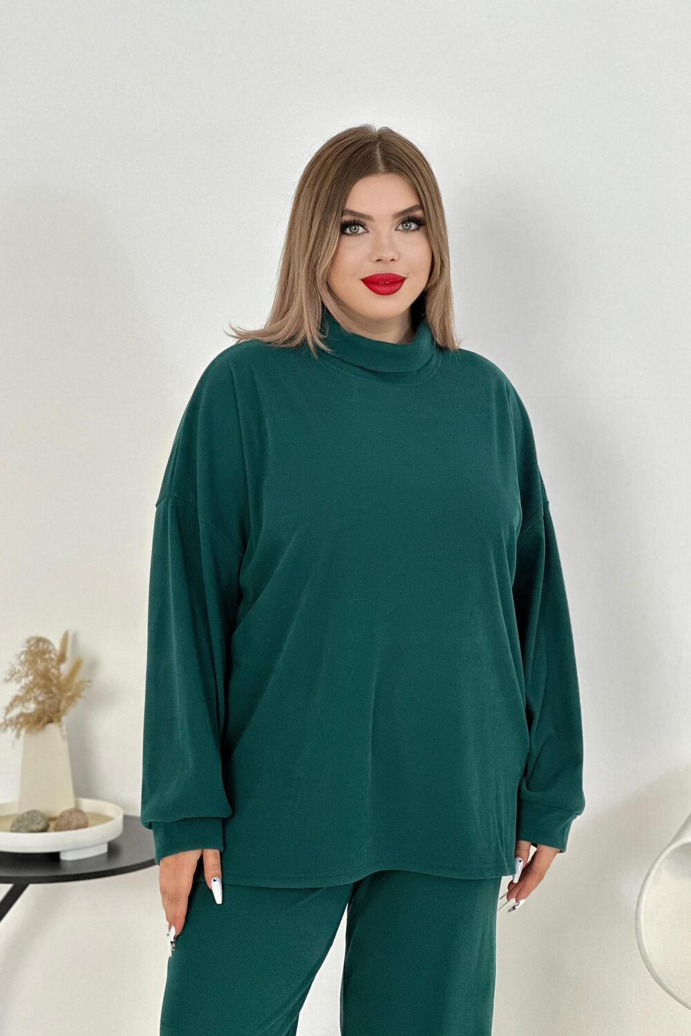Женский костюм - двойка, выполнен из утепленной, мягкой, рельефной ткани. Верх - кофта, достаточно свободного кроя, рукав спущенный на манжете, горловина высокая, также можно носить раздельно от штанов, хорошо будет сочетаться с джинсами или с классическими брюками. Низ - свободные штаны палаццо, пояс на резинке, по бокам карманы. Костюм прекрасно подойдет для прогулок и работы, хорошо в прохладную погоду с жилеткой или пальто, идеально для вашего гардероба. Цвет: изумруд;черный; Материал: вельвет;вельвет; Состав: 80% полиэстер, 15% вискоза, 5% лайкра.