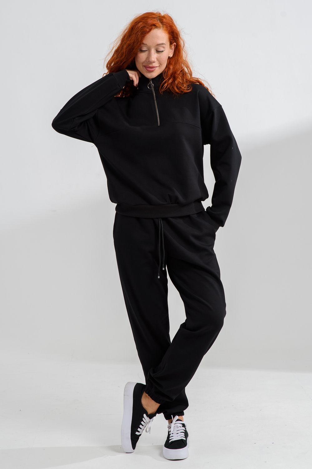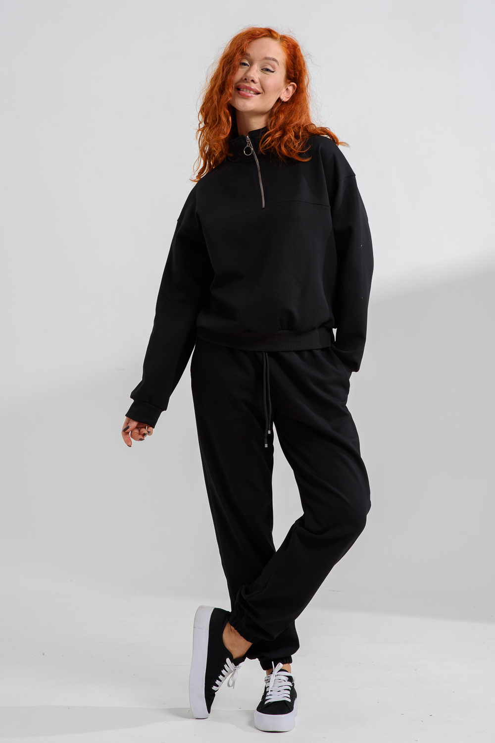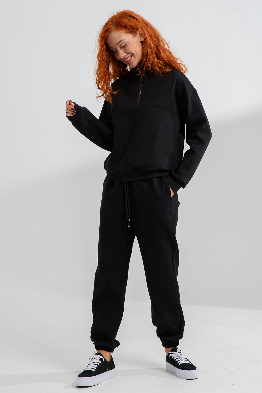 Вам понравится наш невероятно мягкий и уютный женский теплый спортивный костюм. Универсальная кофта на молнии до середины длины без капюшона с воротником-стойкой. Длинные рукава с манжетами не стесняет движения и обеспечивает комфорт, удобные штаны на резинке идеально подходит для прогулок, занятий спортом и тренировок на свежем воздухе и в зале. Модный фасон можно носить вместе или комбинировать. Данный демисезонный комплект двойка отлично впишется в ваш гардероб, как универсальная базовая вещь для зимы, осени и на летние прохладные вечера. Цвет: черный; Материал: интерлок;интерлок; Состав: 70% х/б 25% ПЭ 5% эластан.