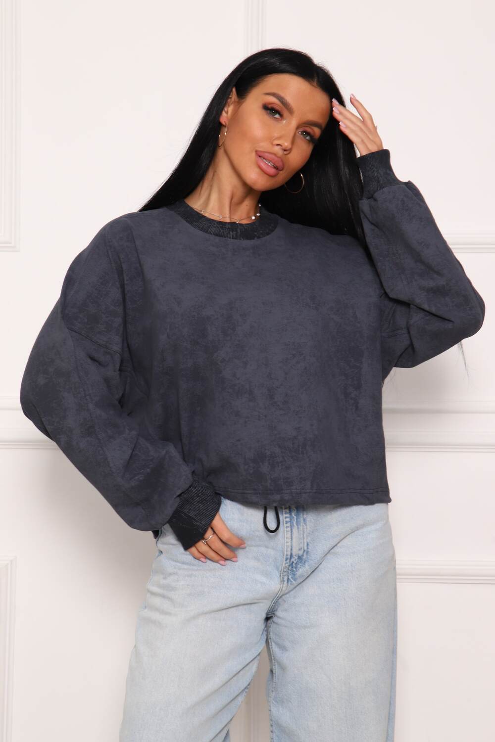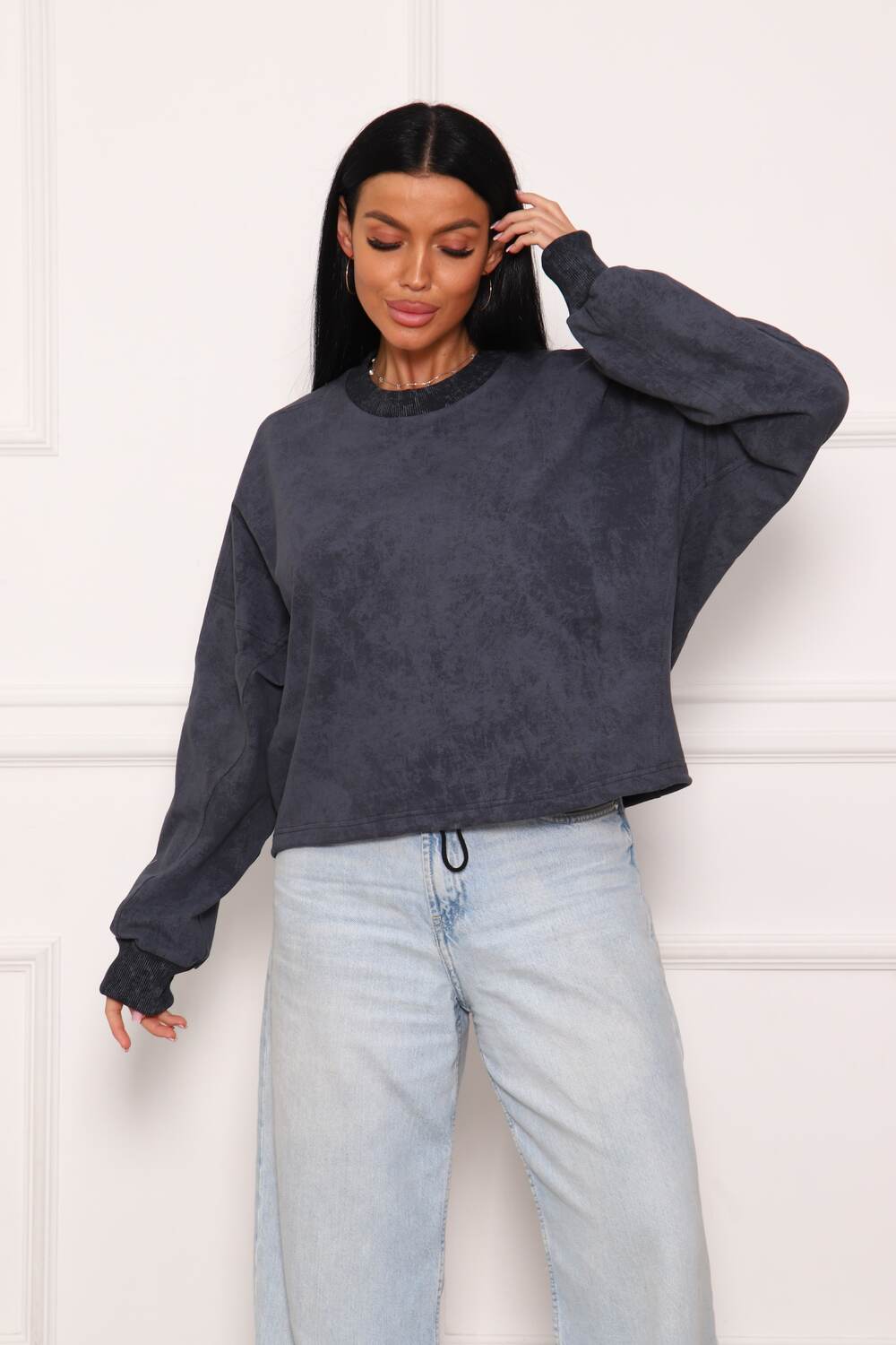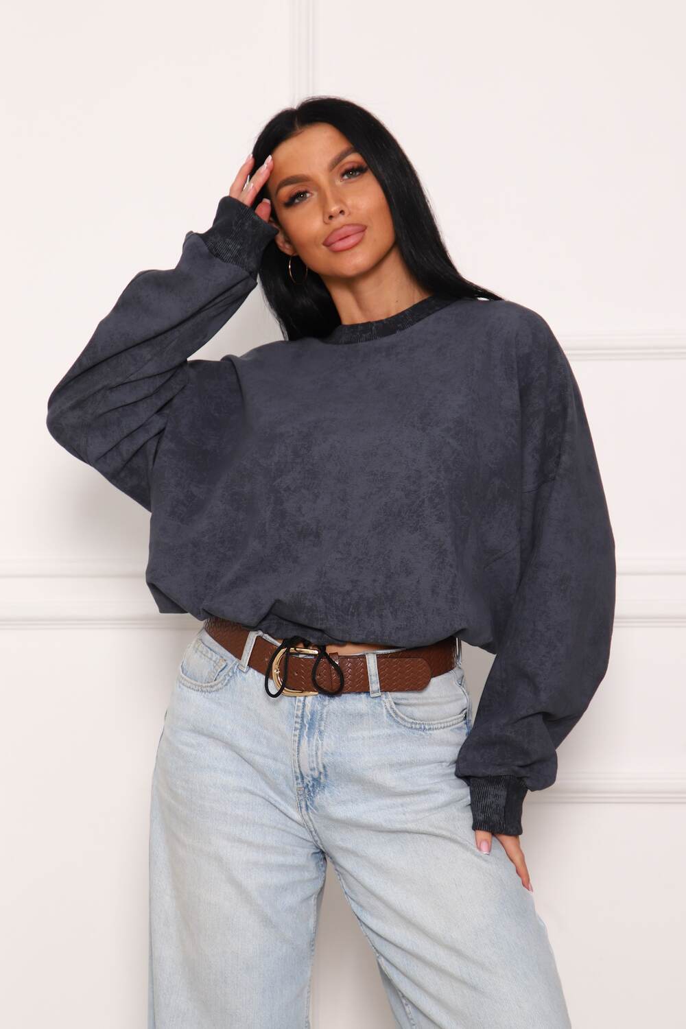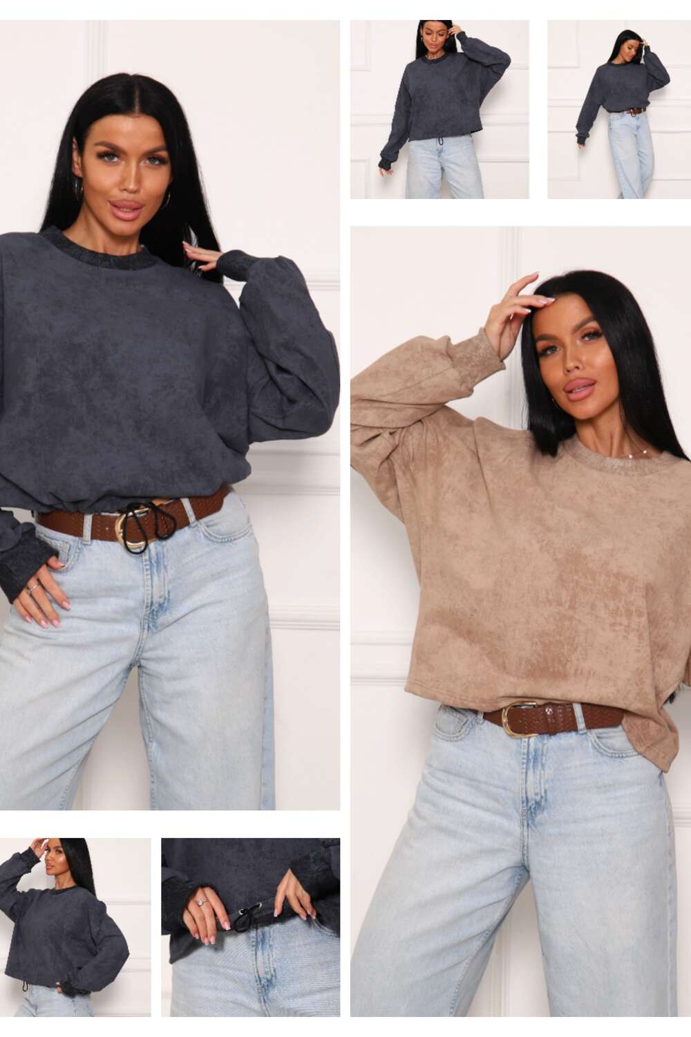 Свитшот женский сложного кроя, из трикотажного полотна с напылением, которое создает эффект стиля винтаж. Свитшот свободного облегания, рукав летучая мышь, на манжете. Горловина круглой формы, обработана обтачкой. Низ изделия на регулируемой кулисе со шнуром. Манжеты и обтачка горловины выполнены из кашкорсе в цвет основной ткани. Цвет: графит;бежевый; Материал: кашкорсе;футер 2-х нитка;футер 2-х нитка;кашкорсе; Состав: Хлопок 95% Лайкра 5%.