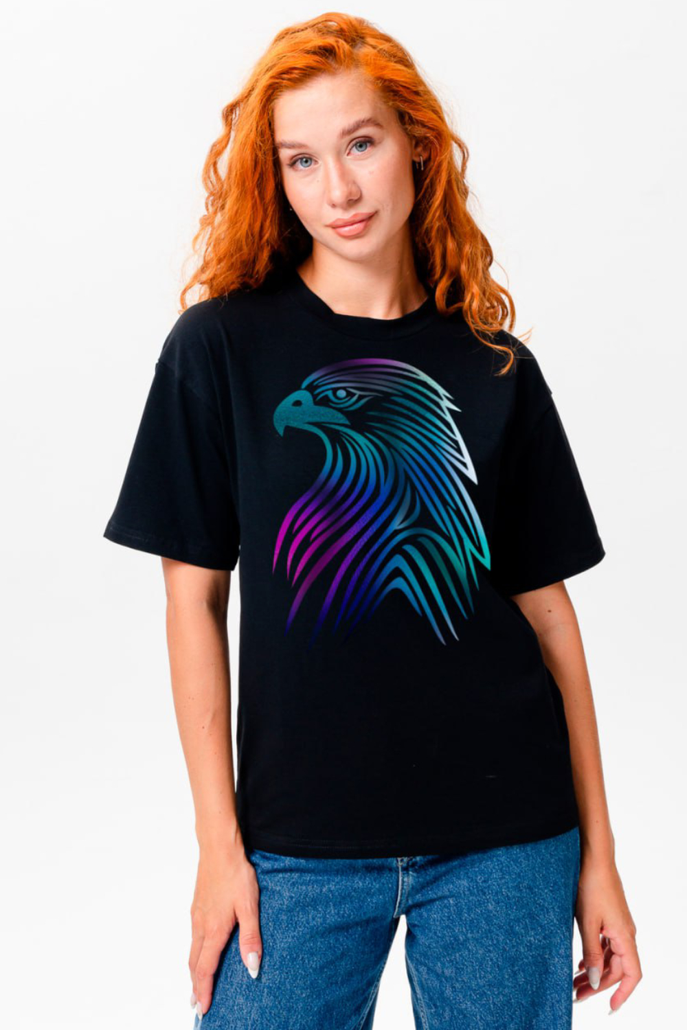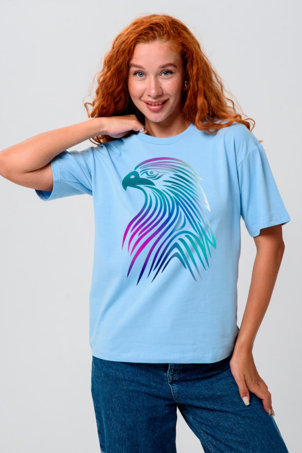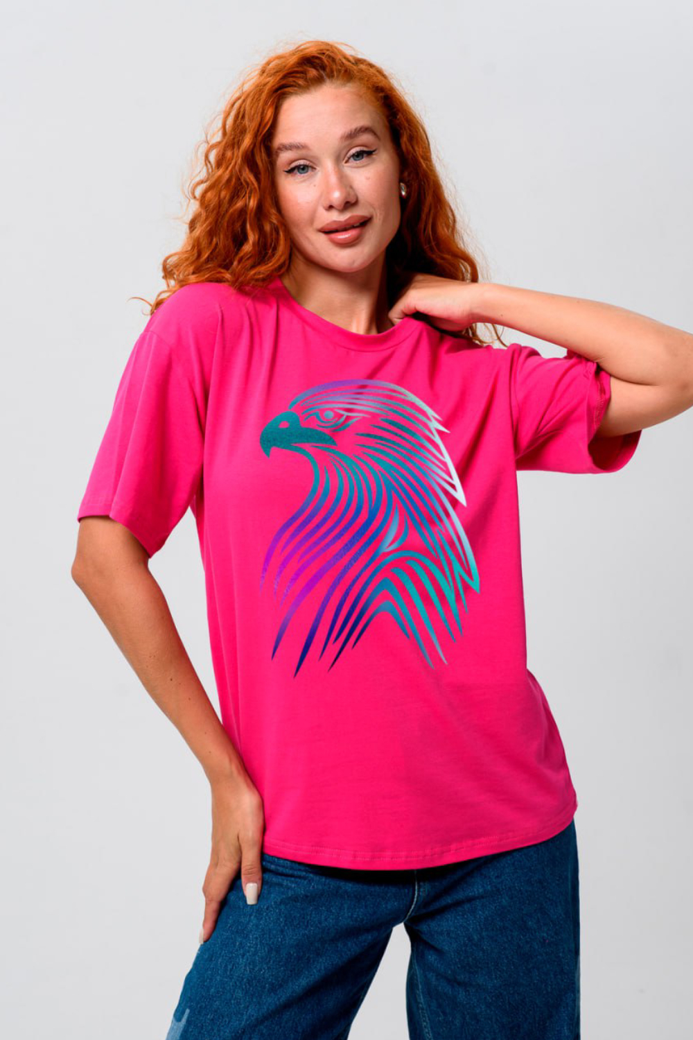 Женская футболка оверсайз это идеальный выбор для девушек, которые любят сочетать комфорт и стиль. Стильная и качественная, она доступна в любом размере, включая большой до 56. Свободный крой подойдет в том числе и для беременных женщин. Высокие стандарты качества делают её универсальным элементом гардероба, подходящим для создания модных повседневных образов. Она идеальна для взрослых и подростков, предпочитающих спортивную и яркая одежду. Высокая плотность ткани 200гр/куб.м. Принт фольга хамелеон или серебро - может попасться без выбора. Цвет: фуксия+орел;черный+орел;голубой+орел;графит+орел; Материал: кулирка с лайкрой; Состав: 92% х/б 8% эластан.