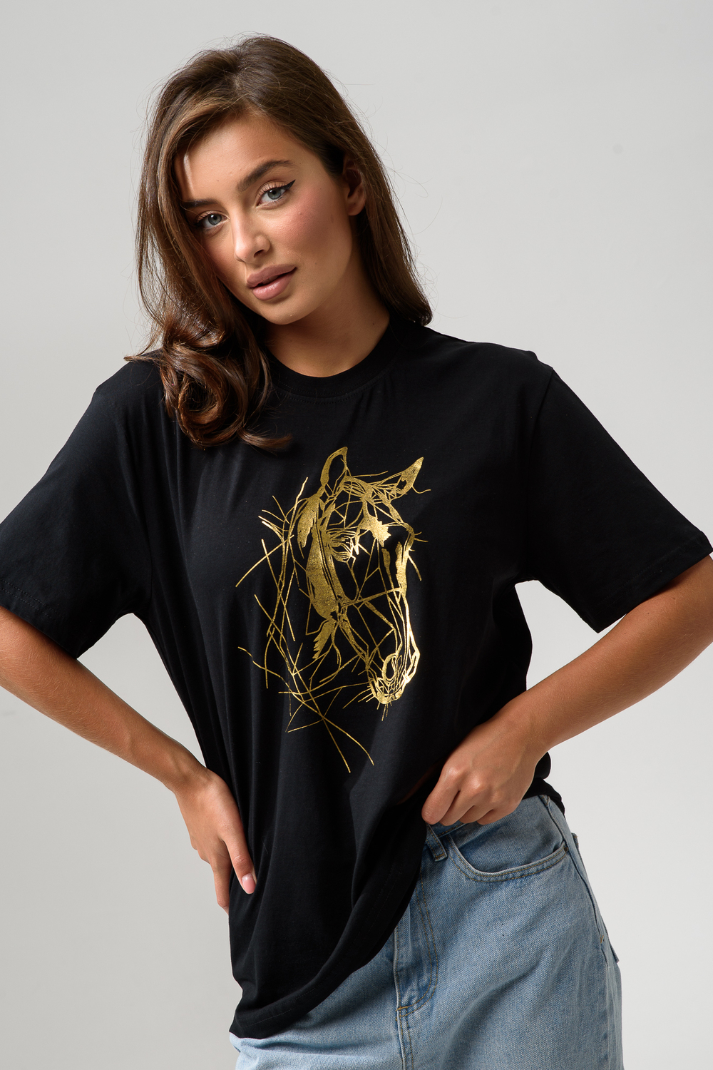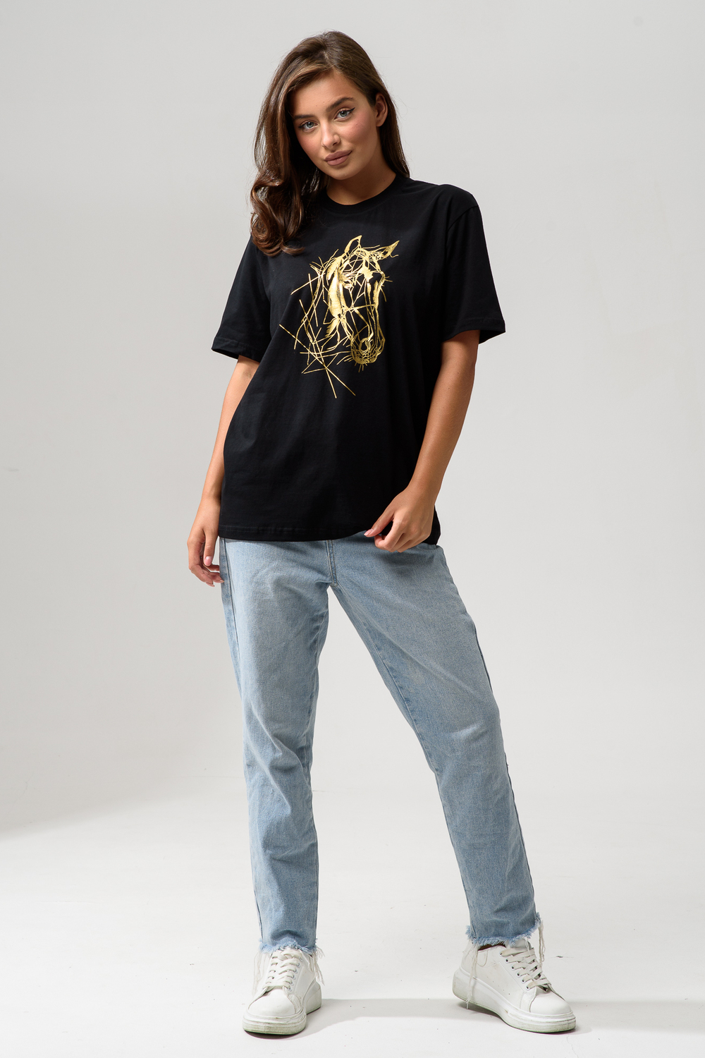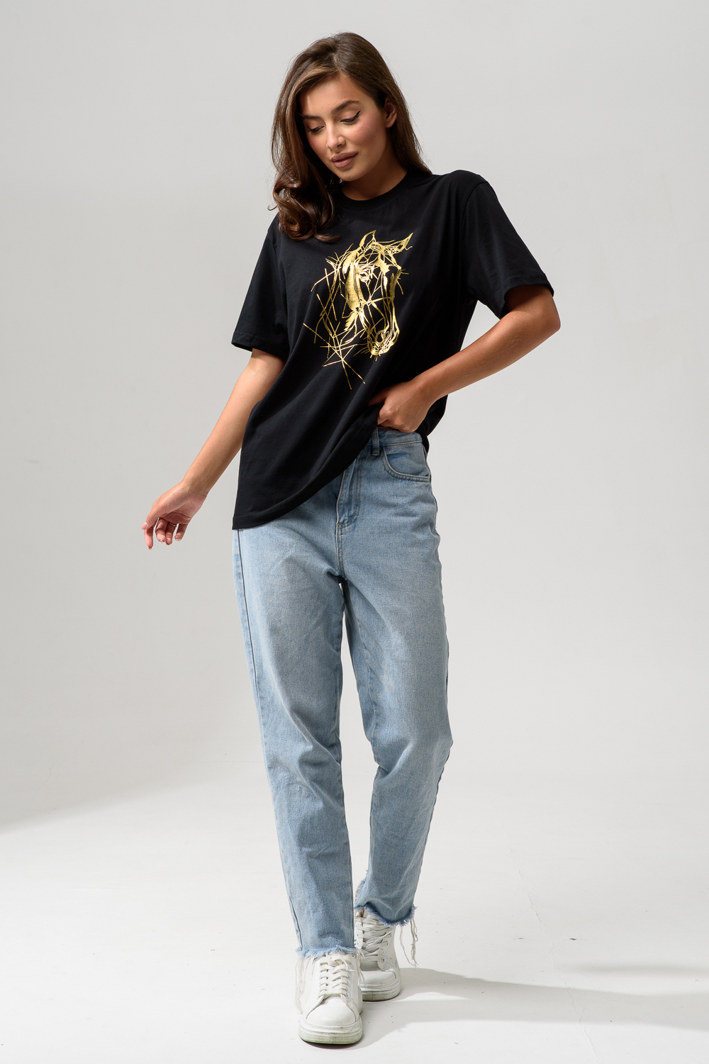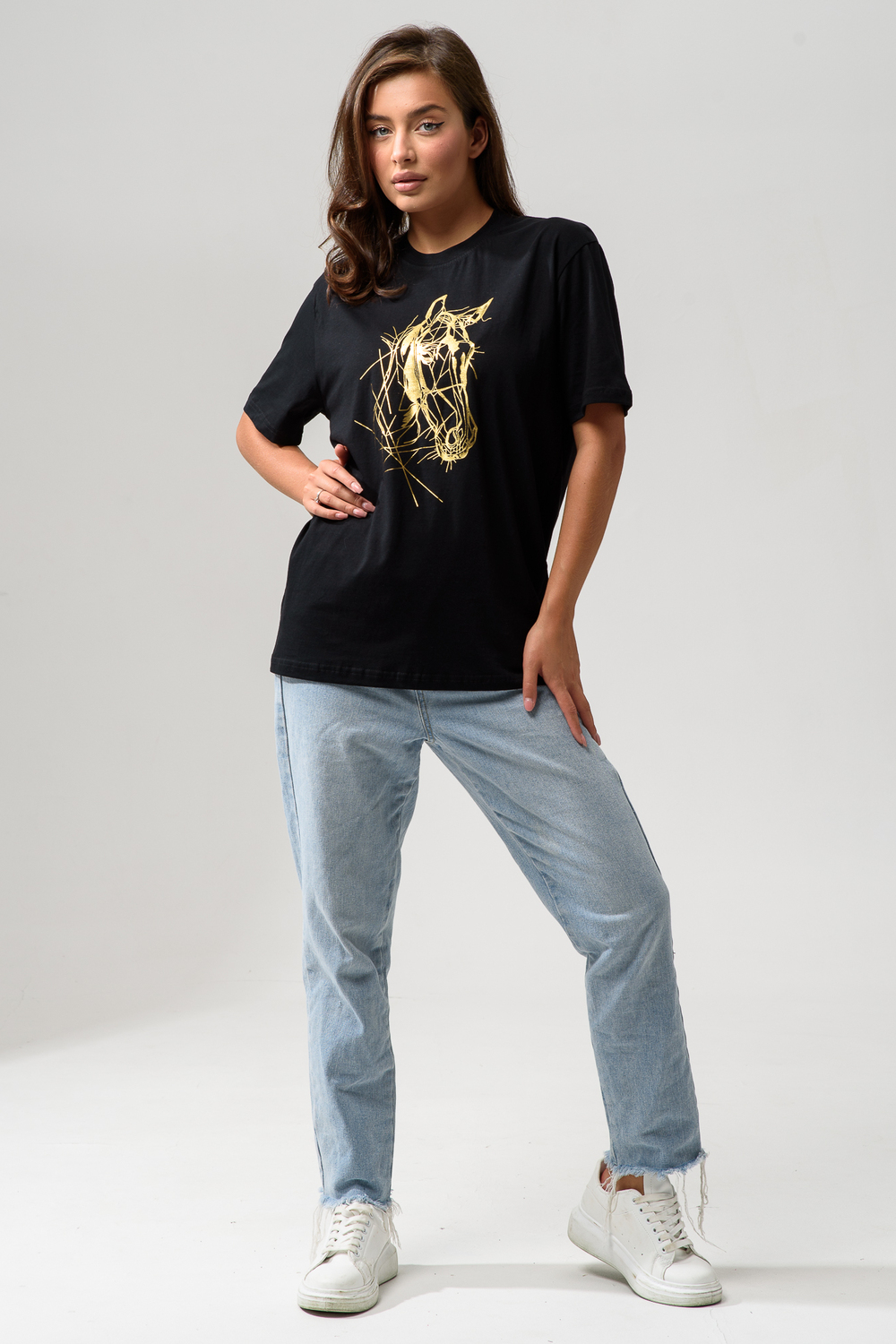 Футболка это идеальный выбор для женщин, предпочитающих комфорт и стиль. Сделанная из 100% хлопка, эта футболка обеспечивает отличную дышащую способность, делая её идеальной для домашнего использования, пляжного отдыха или просто для повседневного ношения. Уникальный принт на передней части добавляет элемент индивидуальности и стиля, делая эту футболку отличным дополнением к вашему гардеробу. Принт фольга. Цвет: черная фольга +силуэт; Материал: кулирка;кулирка; Состав: 100% х/б.