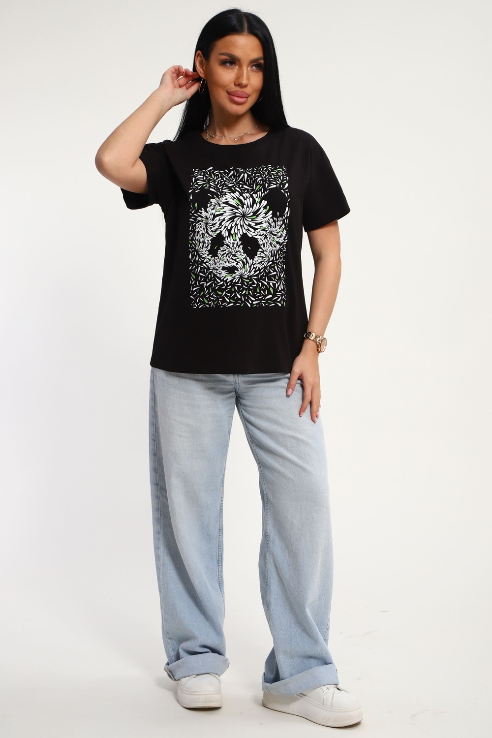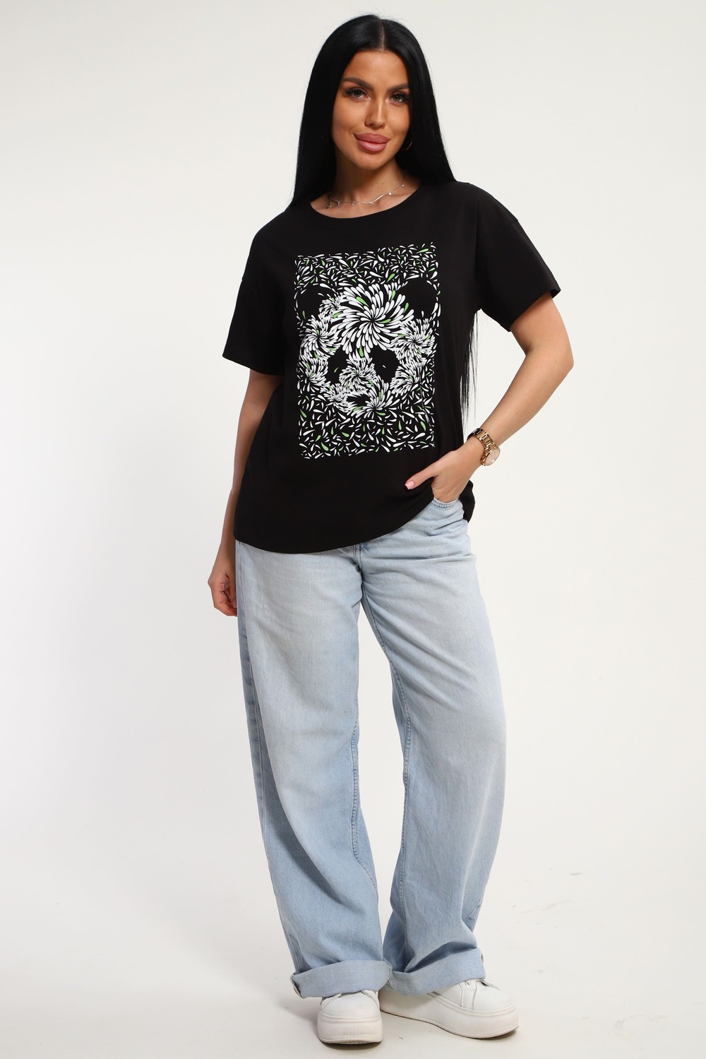 Футболка женская из гладкокрашенного трикотажа, хлопок 100%. Прямого силуэта, свободного облегания. горловина круглой формы. Рукав короткий. Низ изделия прямой. На полочке принт, шелкография. Цвет: черный; Материал: кулирка;кулирка; Состав: хлопок 100%.
