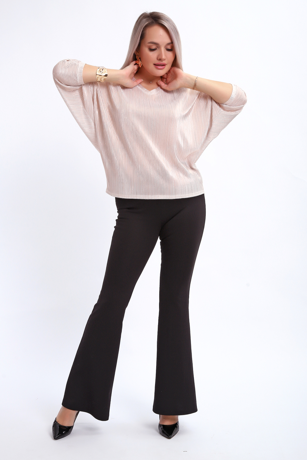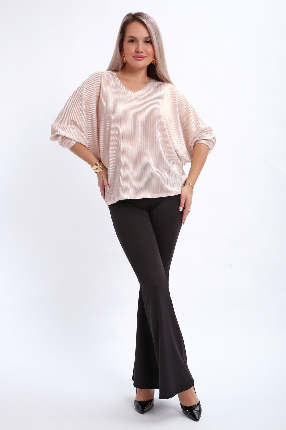 Сделайте акцент на вашем стиле с помощью комфортной и изысканной блузки. Нарядная кофта - это необходимый предмет в любом гардеробе. Благодаря свободному крою, она идеально садится на любую фигуру, скрывая то, что хотелось бы спрятать и подчеркивая достоинства. Блузка выигрышно смотрится за счет ткани атлас гофре со стойким напылением фойл, которое не осыпается в процессе носки и после стирки. Ткань атлас гофре хорошо тянется и драпируется, имеет мягкий благородный блеск и совершенно не мнется. Крой блузки лаконичен, без лишних деталей, рукав летучая мышь не сковывает движений, имеет длину 3/4 и оканчивается небольшим манжетом. V-образный воротник зрительно удлиняет шею, обработан обтачкой, длина блузки до линии бедра. Легкая изящная блузка отлично впишется в вечерний наряд, а также будет блестящим дополнением к деловому и повседневному образу. Цвет: экрю;черный;жемчуг; Материал: атлас стрейч;атлас стрейч; Состав: 98% п/э, 2% лайкра.