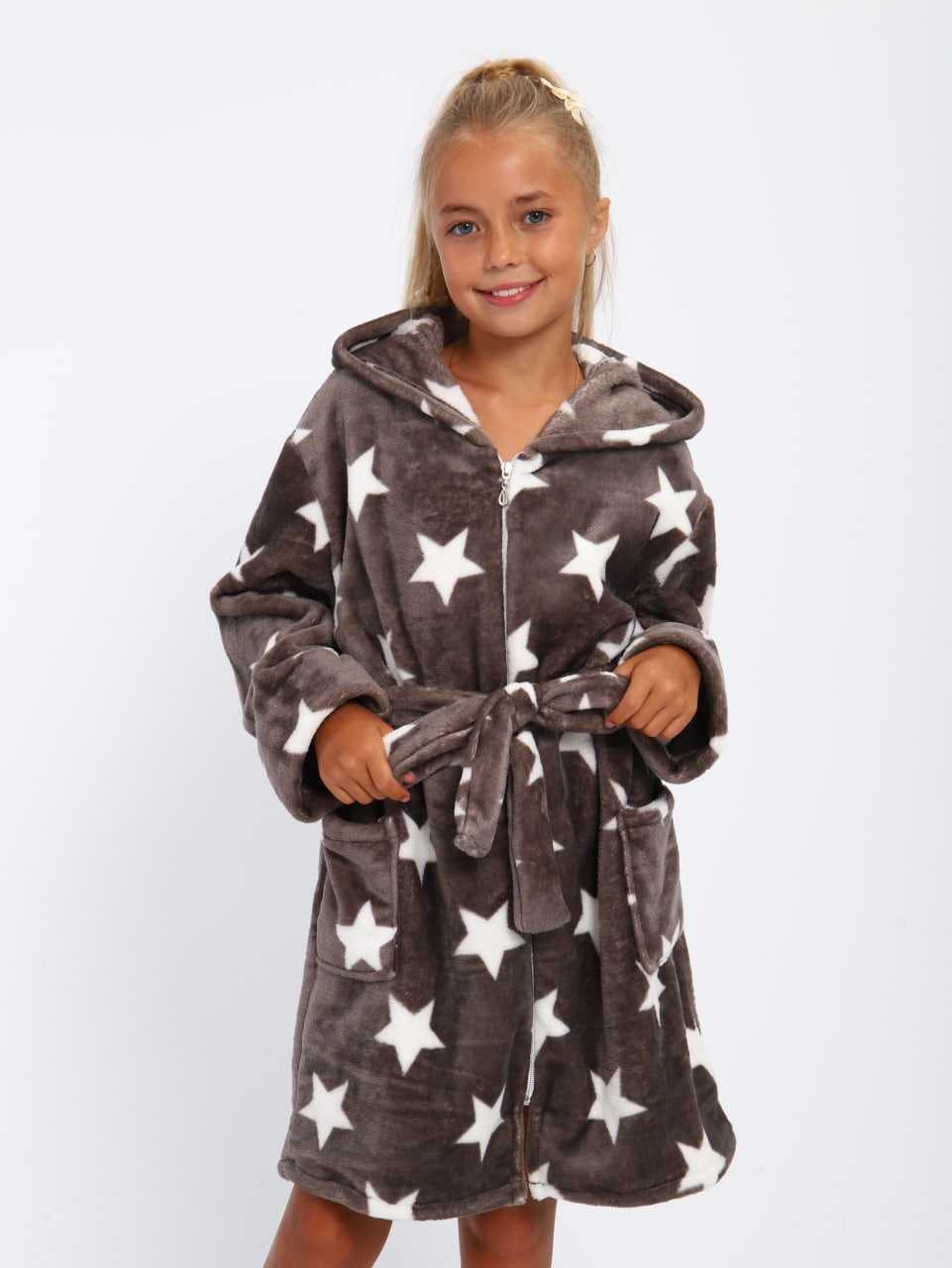 Мягкий детский халат из ткани экстрасофт подарит тепло и уют вашему малышу. Лёгкий, нежный и очень приятный на ощупь материал прекрасно сохраняет тепло и быстро сохнет, поэтому халатик удобно надевать после купания или просто дома для комфорта. Свободный крой не сковывает движений, капюшон защищает от прохлады, а пояс позволяет регулировать посадку. Яркие забавные принты делают модель ещё более привлекательной для детей и превращают её в любимую домашнюю одежду. Цвет: Звездочка на сером;мишки/синий;сердечки на синем;Коты на сером; Материал: экстрасофт;экстрасофт; Состав: 100% полиэстер.