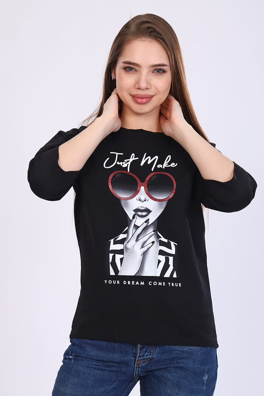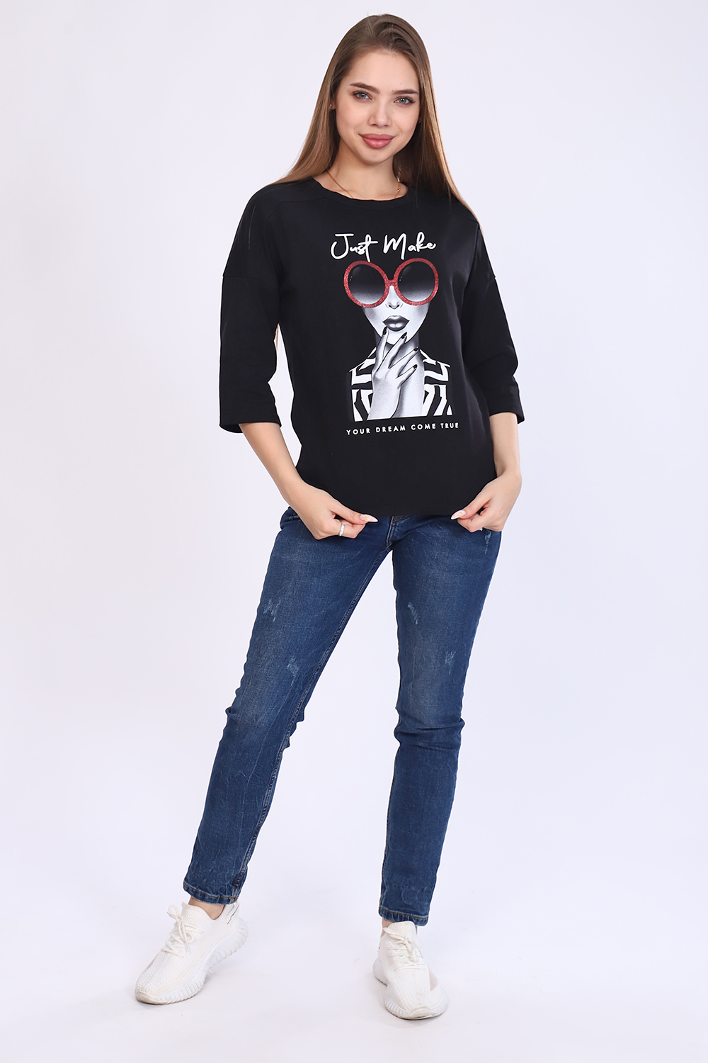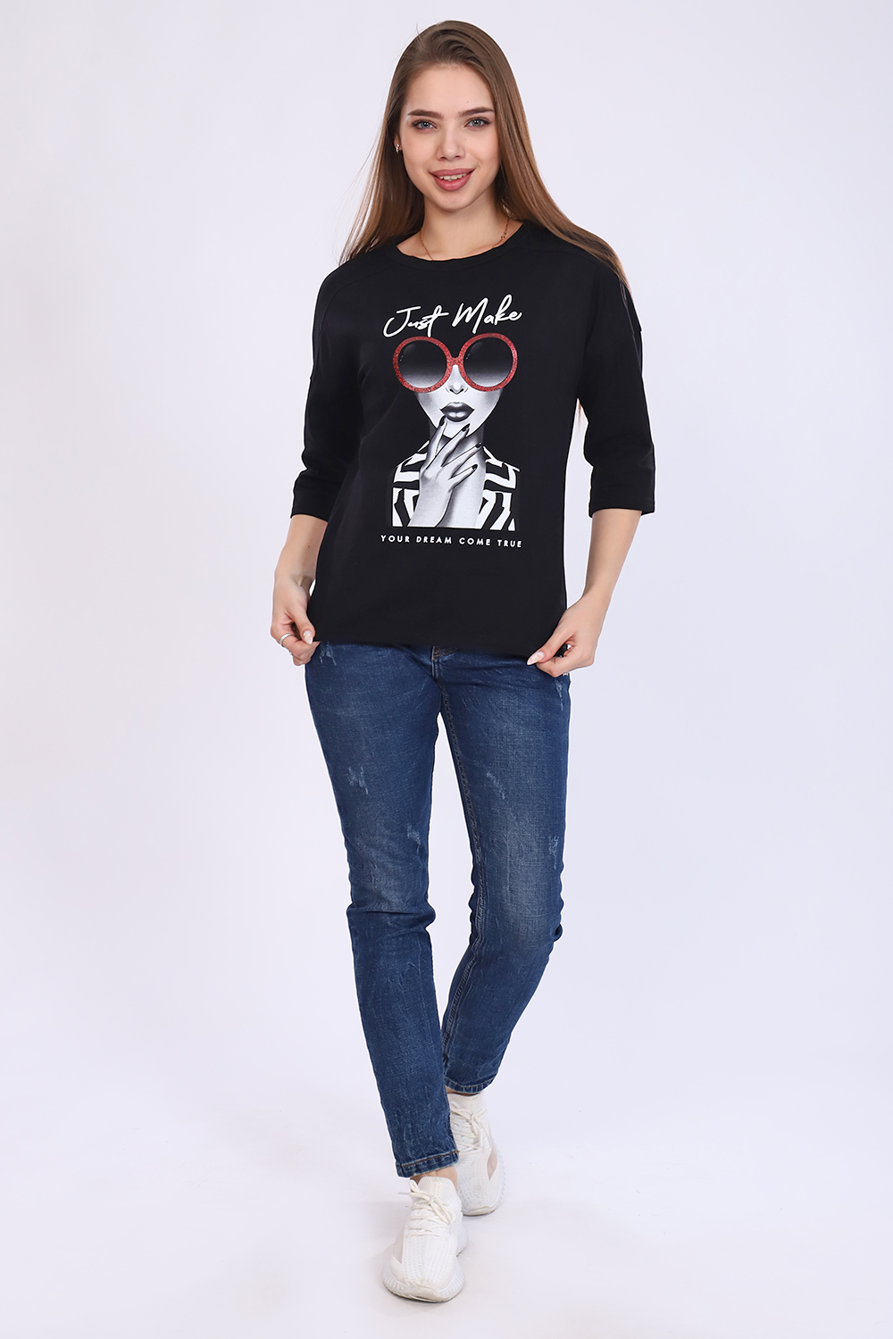 Джемпер женский с ярким, оригинальным принтом из мягкого футера с лайкрой 2-х нитка. Модель слегка приталенного силуэта, круглая горловина обработана обтачкой, спущенная пройма, свободный 3/4 рукав, на спинке кокетка, низ слегка удлинён и закруглён. Стильный, комфортный джемпер необходимая вещь в гардеробе деловой, современной девушки, отличный офисный вариант, хорошо будет смотреться как с брюками, так и с юбкой. Цвет: черный;лиловый;аметист; Материал: футер с лайкрой 2-х нитка;футер с лайкрой 2-х нитка; Состав: хлопок 70%, п/э 24%, лайкра 6%.
