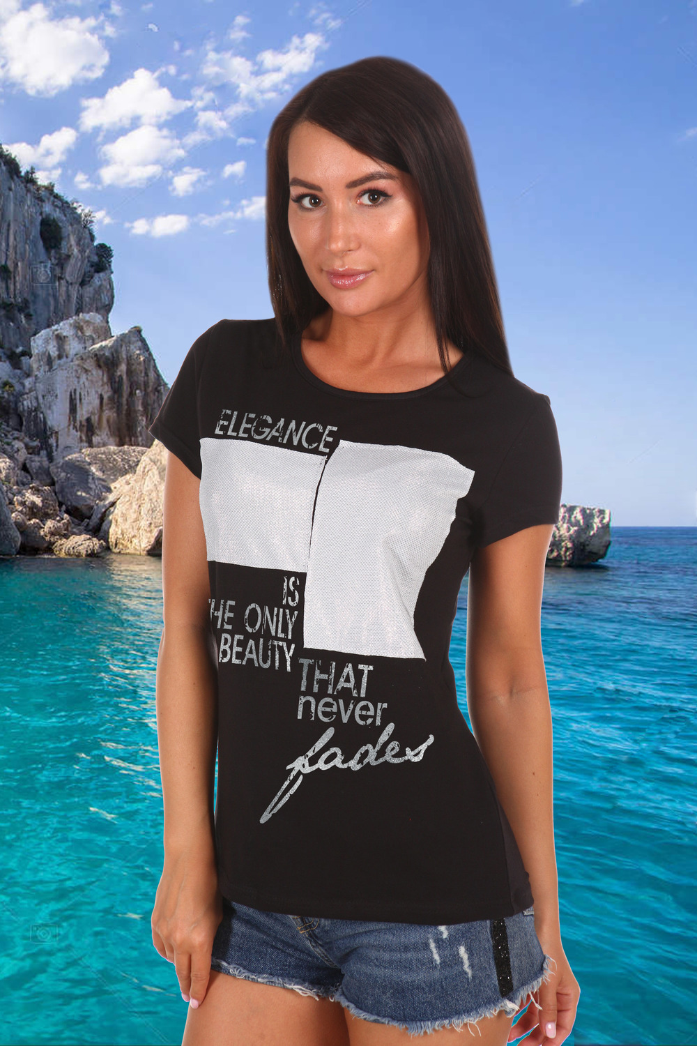Футболка полуприлегающего силуэта, с округлой горловиной, длиной до середины бедра. Рукав втачной короткий. На полочке расположены декоративные элементы из отделочного полотна. Горловина обработана бейкой