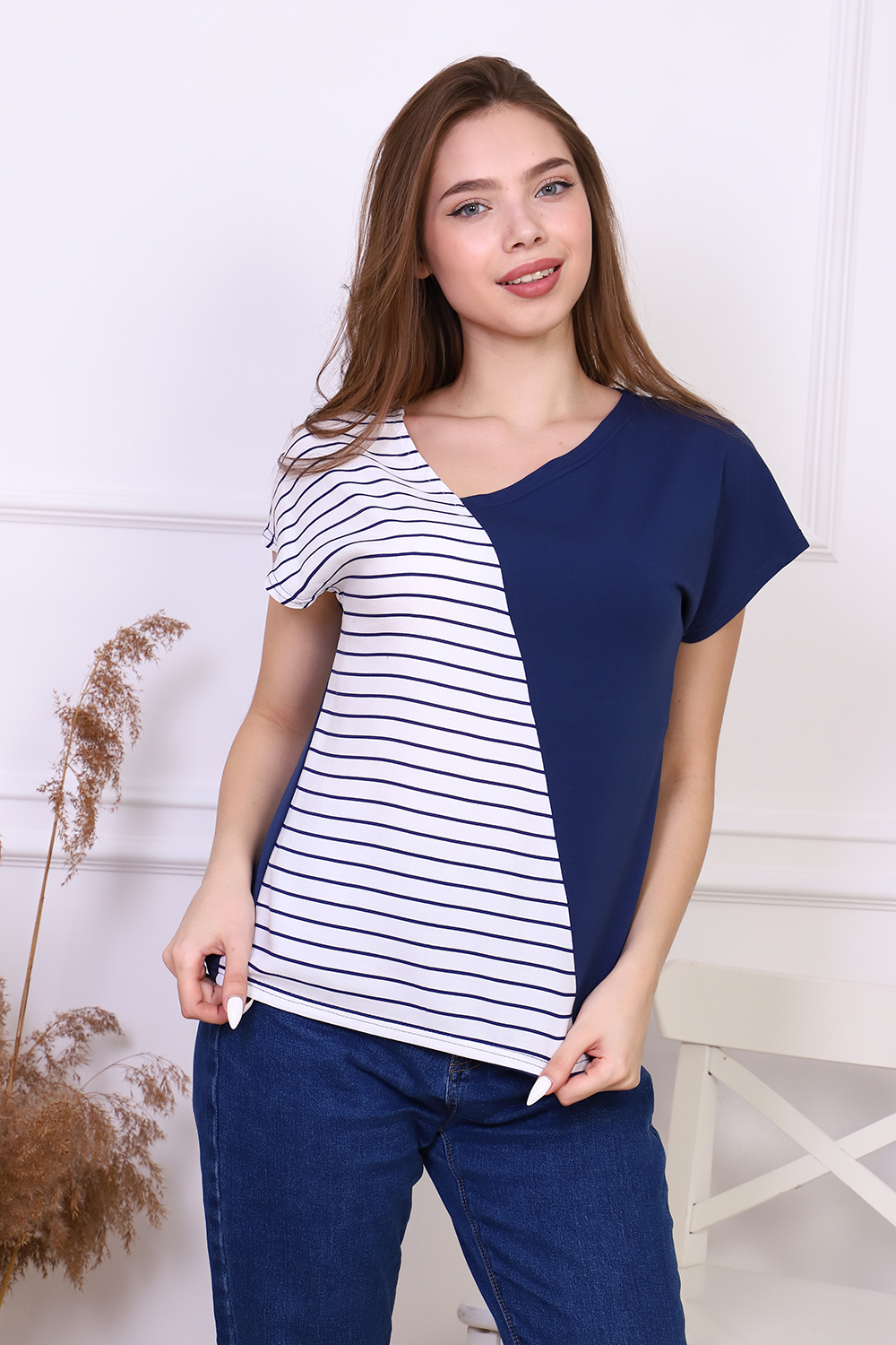 Стильная, лёгкая, приятная к телу футболка из комбинированных тканей - штапеля и кулирки с лайкрой качества пенье. Модель свободного покроя, асимметричный фигурный вырез горловины, спущенная пройма. Футболка - это базовая комфортная вещь женского гардероба. Этот предмет одежды может легко вписаться в любой стиль современной модницы. Цвет: синий; Материал: кулирка с лайкрой пенье;штапель;кулирка с лайкрой пенье;штапель; Состав: хлопок 94%, лайкра 6%, вискоза 100%.