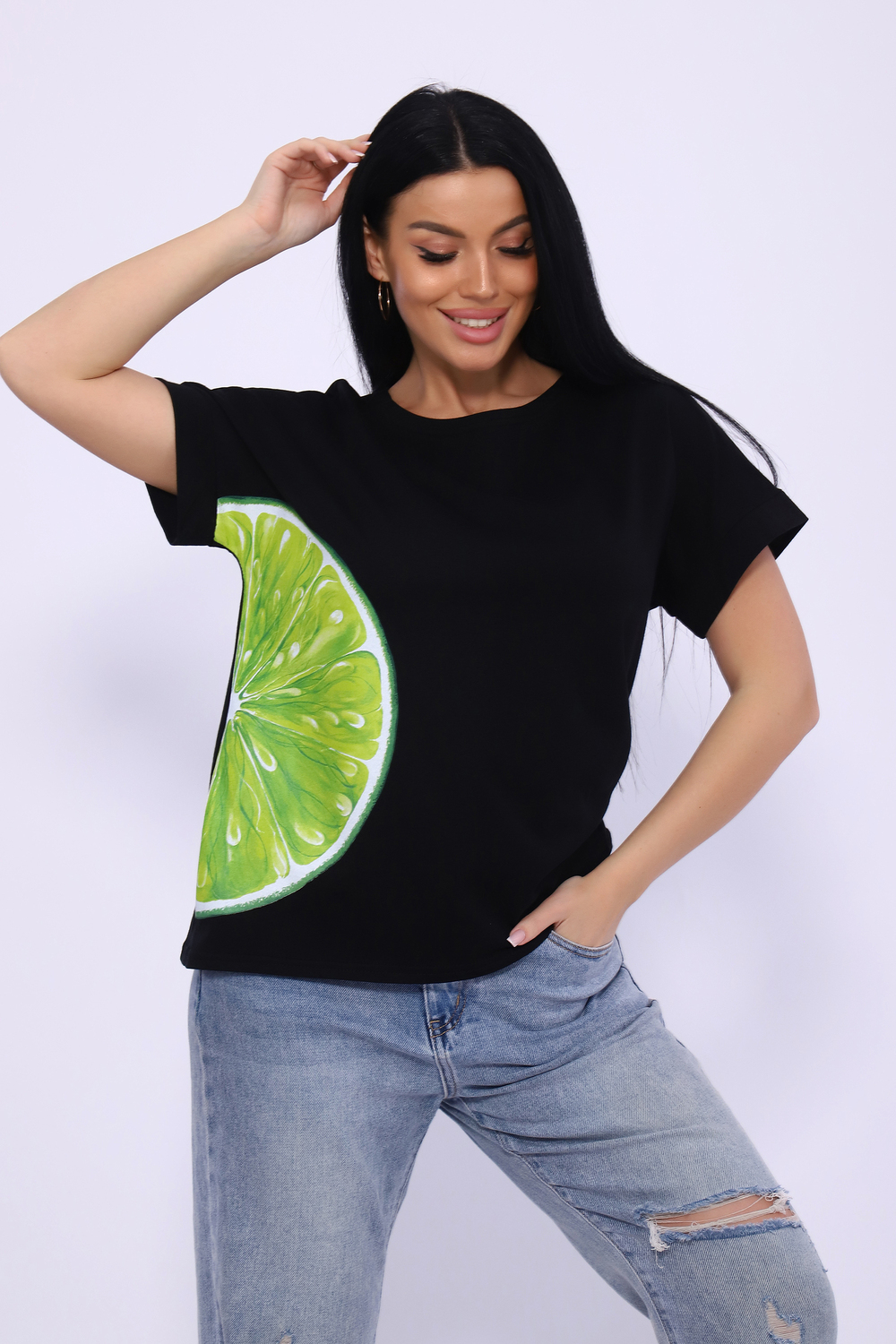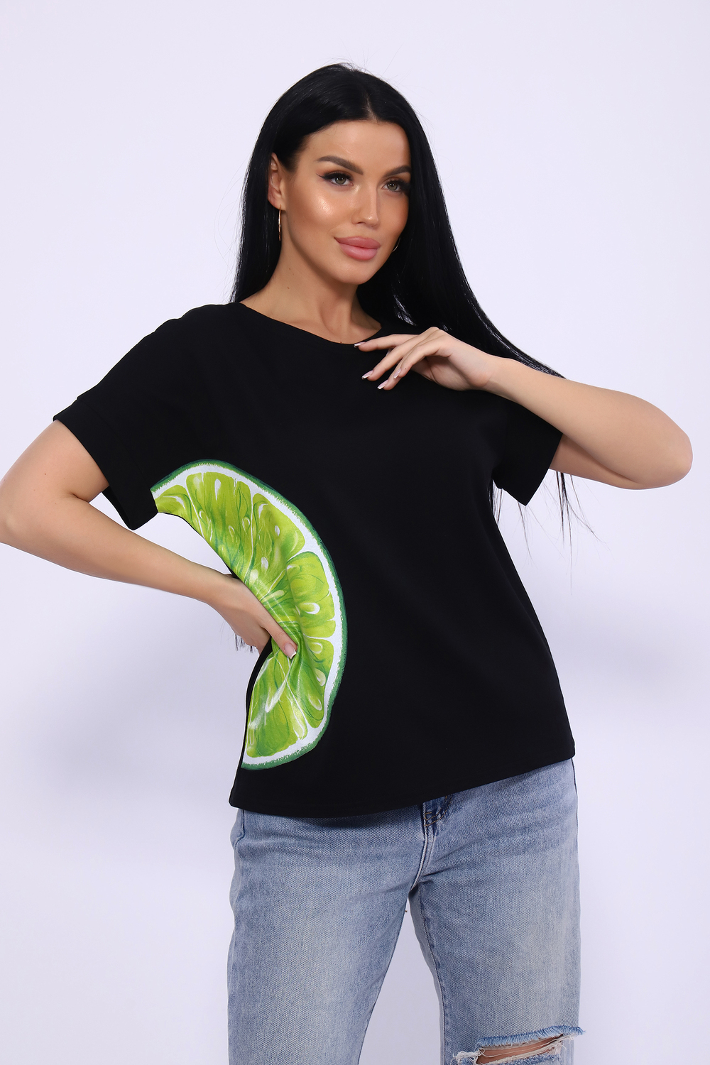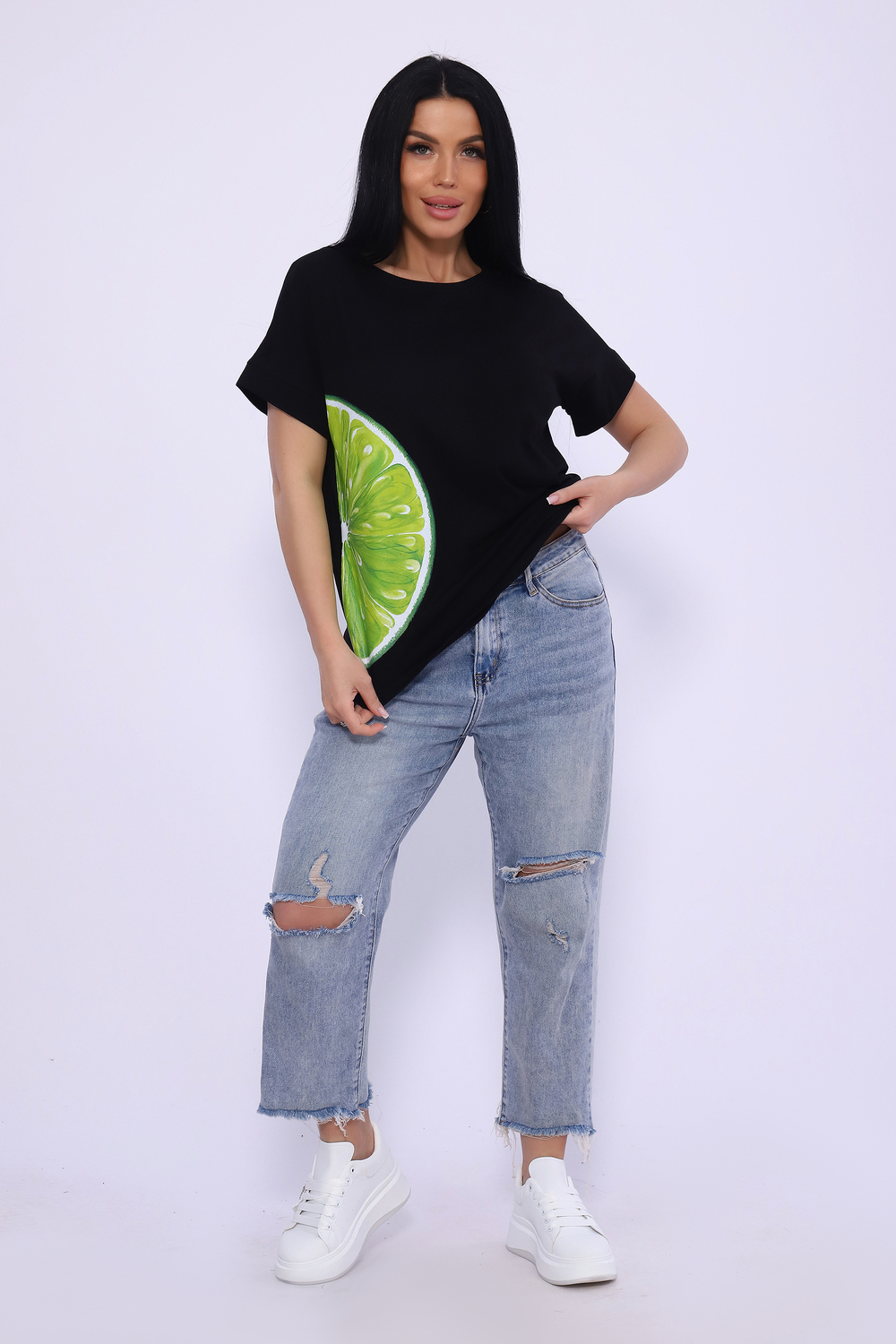 Футболка женская с ярким 3-Д принтом, из кулирки высокого качества пенье компакт. Модель свободного кроя, горловина в виде лодочки, спущенная пройма на манжете. Стильная, приятная к телу из 100% хлопка футболка необходимая вещь в гардеробе современной девушки. Цвет: черный;белый; Материал: кулирка;кулирка пенье;кулирка;кулирка пенье; Состав: хлопок 100%.