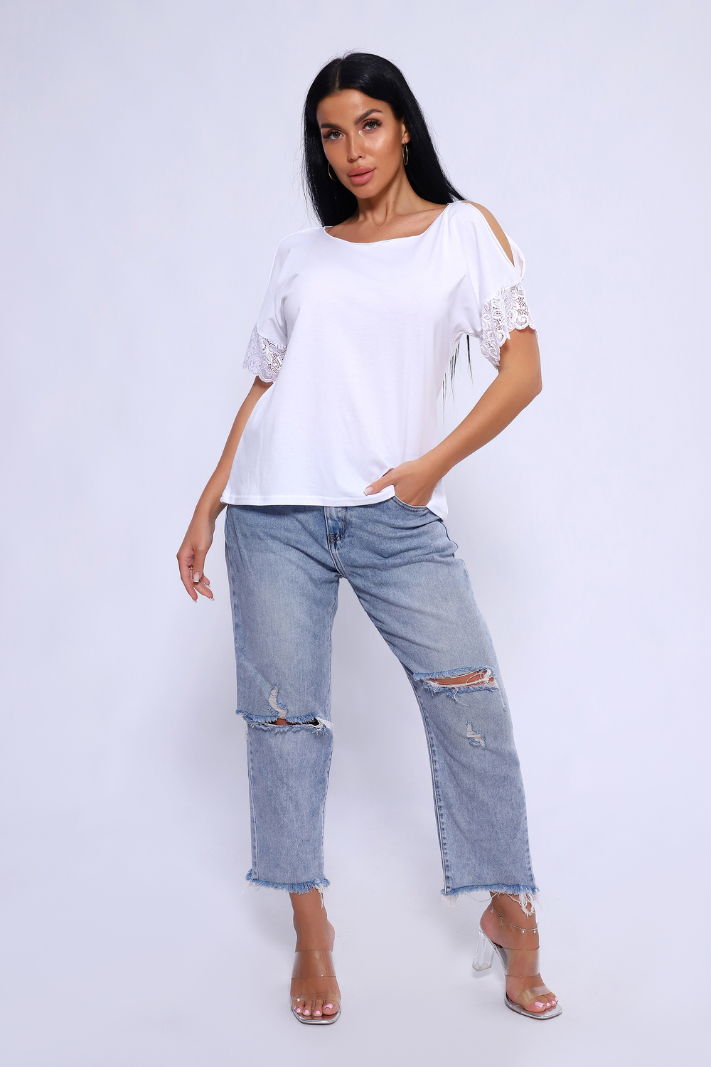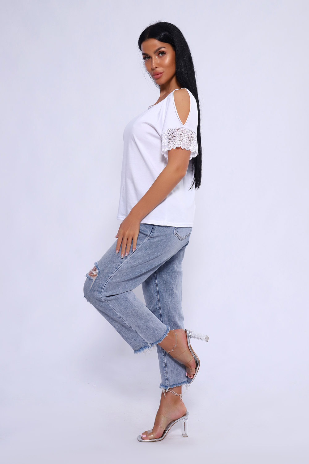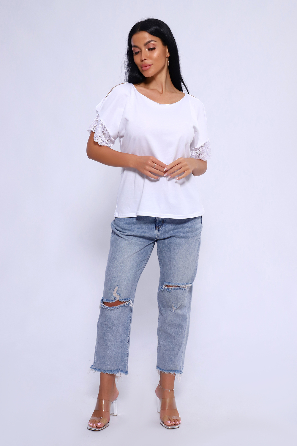 Футболка женская из гипоаллергенного хлопкового трикотажа - кулирки высокого качества пенье компакт. Модель слегка приталенного силуэта, горловина и спущенная пройма обработаны краёвкой, что придаёт футболке некую изюминку и индивидуальность. Пройма обработана широким, жаккардовым кружевом в виде короткого рукава. Стильная, комфортная футболка необходимая вещь для модницы любого возраста и фигуры, подойдет как для офисного гардероба так и для отдыха, активного занятия спортом. Цвет: белый;черный;графит; Материал: кулирка пенье компакт;кулирка пенье компакт; Состав: хлопок 100 %.