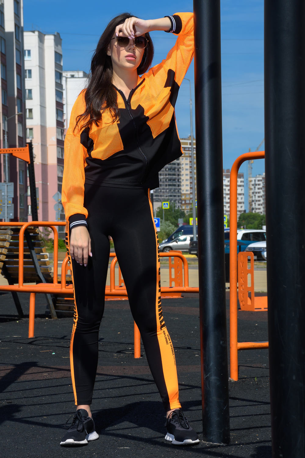 Комплект состоит из толстовки и майки. Толстовка прямая, свободная, с капюшоном из сетки, на молнии. Рукав длинный, из сетки, на эластичном манжете. Спинка удлиненная, из сетки. В верхней части полочки расположены кокетки из сетки. На полочку настрочены накладные карманы с клапанами из сетки. Майка на бретелях, полуприлегающая. Цвет: желтый;зеленый;оранжевый;розовый; Материал: вискоза;сетка;сетка;вискоза; Состав: виск.50%, ПЭ 45%, лайк.5%, вискоза 92%, лайкра 8%.
