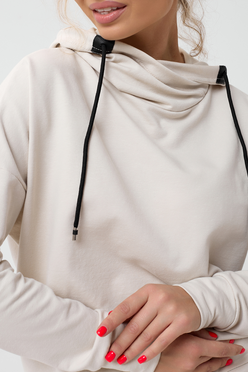 Молодежный костюм из футера 2-х нитки. Худи с длинным рукавом и с капюшоном. Брюки - джоггеры с резинкой на ногах, по бокам внутренние карманы, пояс на резинке. Очень стильный и необычный капюшон. Цвет: молочный; Материал: футер 2-х нитка;футер 2-х нитка; Состав: 74% хлопок 20% п/э 6% лайкра.