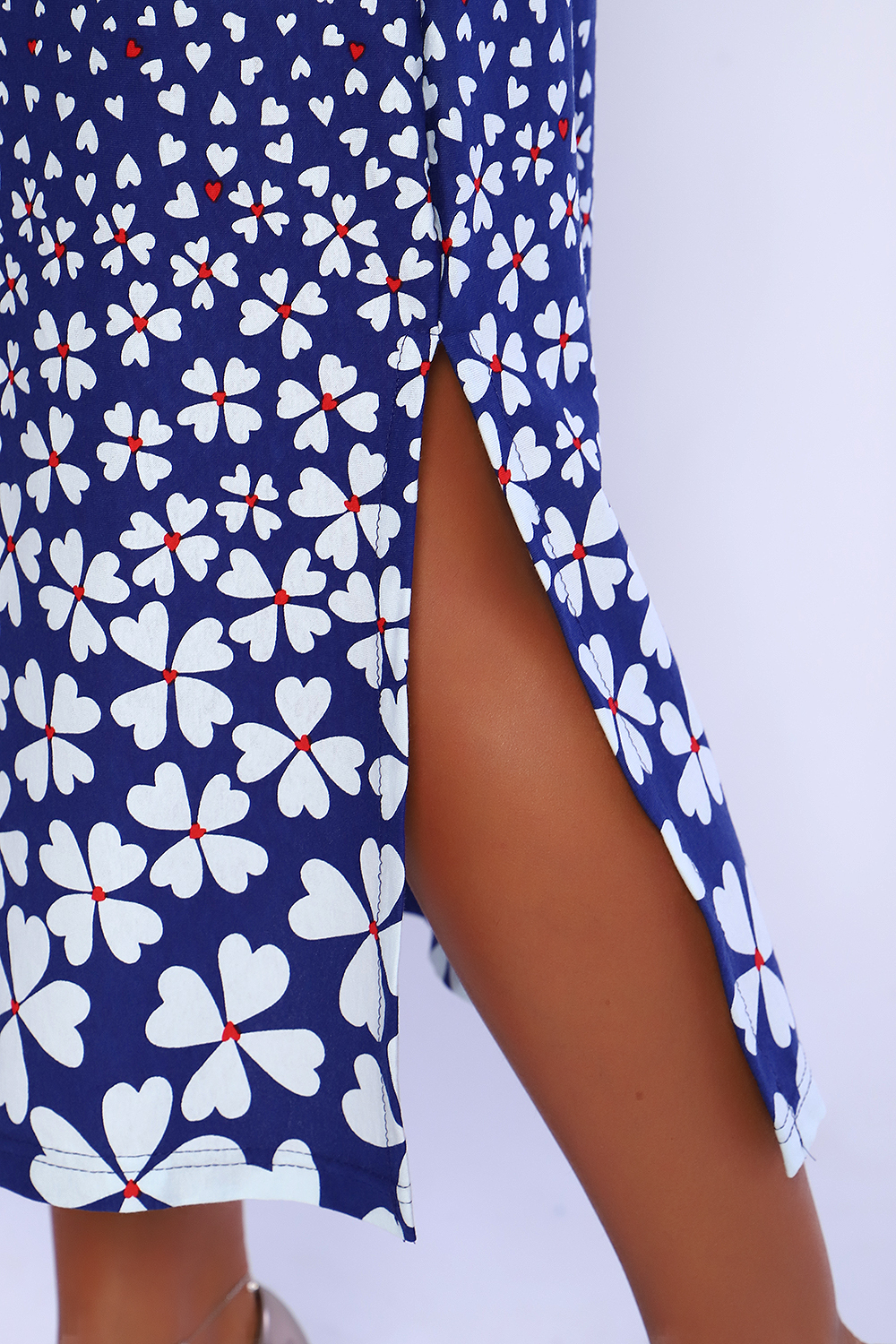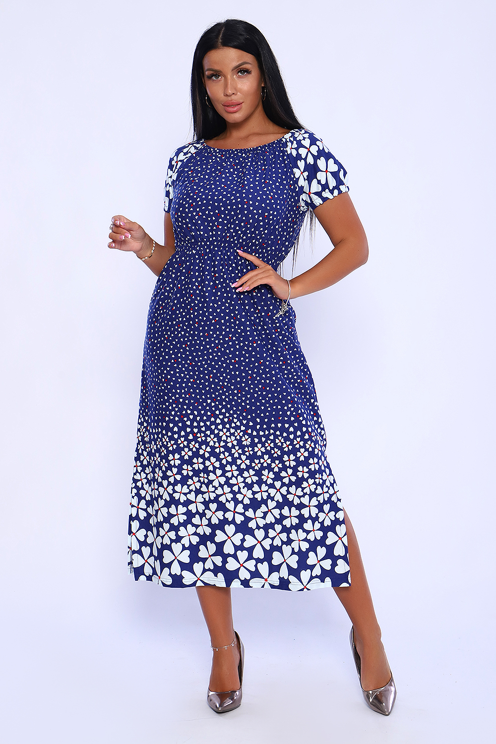 Женское платье свободного кроя с небольшими рукавами регланами, собранными на резинке. Завышенная линия талии собрана на тонкую резинку в три ряда. Длина ниже средней. Горловина присобрана на тонкой резинке. По боковым швам внизу разрезы. Подходит для домашнего и повседневного ношения. Цвет: джинс;темно-синий; Материал: кулирка;кулирка; Состав: 100% хлопок.