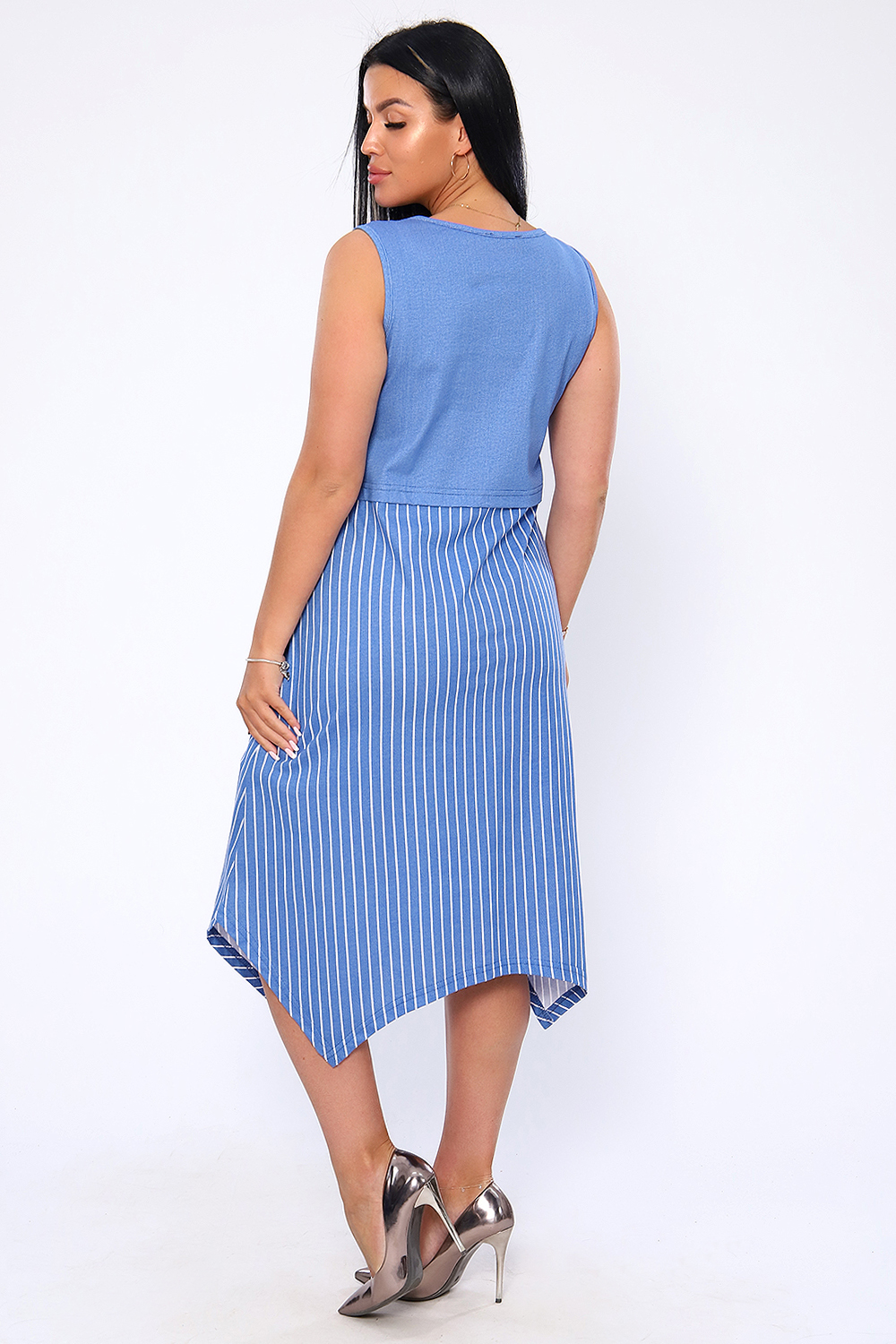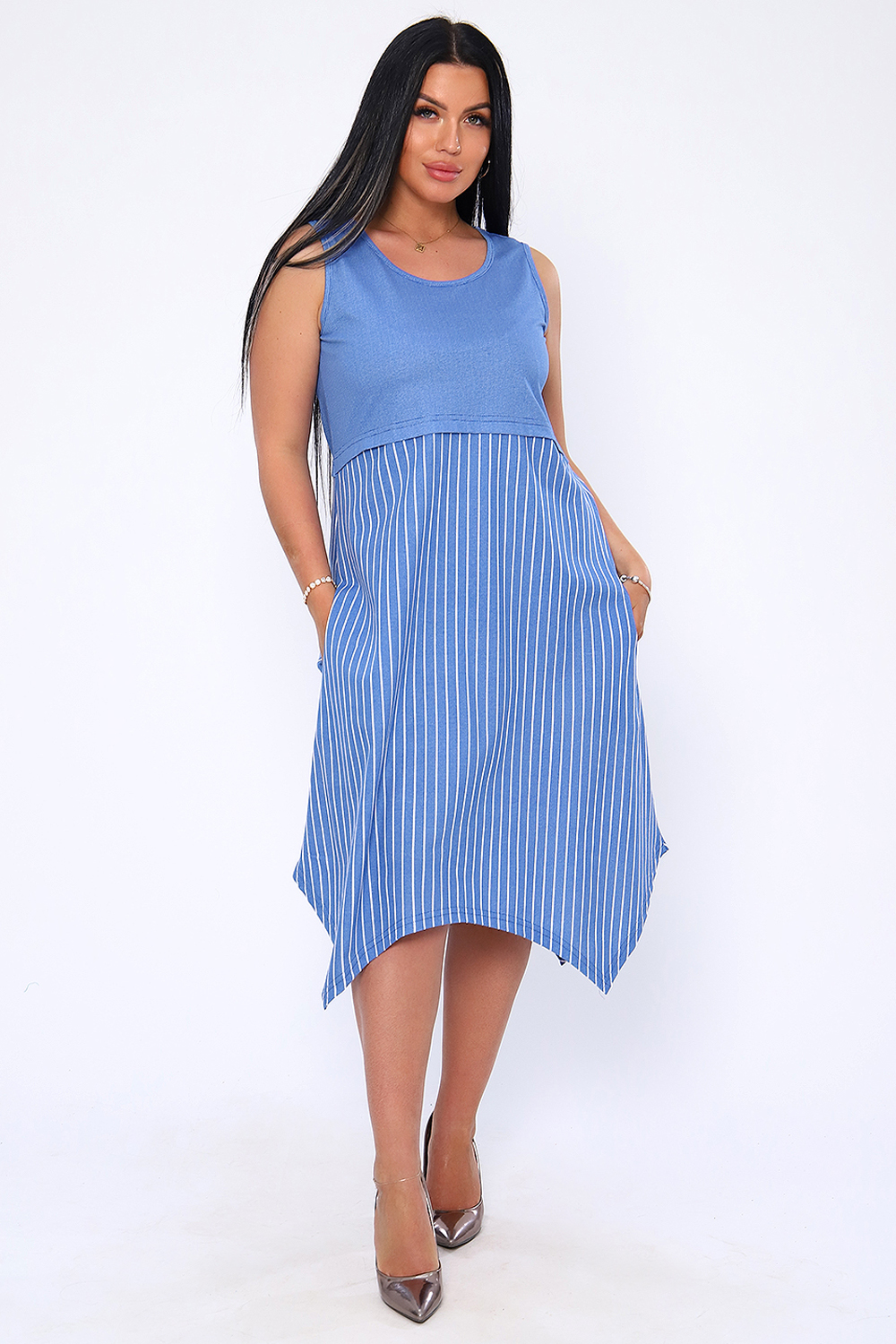 Женский летний сарафан - платье А - силуэта с завышенной талией и небольшой декоративной складкой на кокетке переда с боковыми карманами в шве. Низ изделия выполнен с угловыми вырезами. Сшит из трикотажного полотна, 100%-го хлопка, что позволяет телу дышать и чувствовать себя комфортно в жаркий день. Длина изделия ниже колена. Удобный сарафан, приятный к телу, не стесняет движения. Любителям носить одежду в обтяжку можно брать на размер меньше. Подойдет на любую фигуру, скроет недостатки. Отлично смотрится на беременных. Приятные и стойкие цвета ткани. Широкий размерный ряд 44-56. Для дома и дачи, для отдыха и прогулок, в отпуск, на море. Отличный подарок любимым девушкам и женщинам! Цвет: джинс; Материал: кулирка;кулирка; Состав: 100% хлопок.