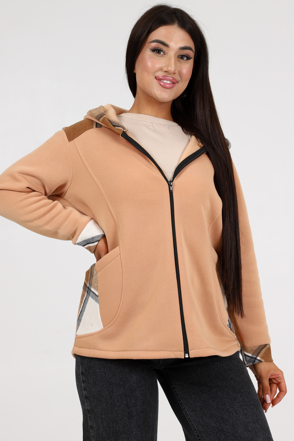 Женская толстовка на молнии с капюшоном. Изделие прямое, длинный рукав на манжете, передняя полочка декорирована рельефными швами, имеются карманы. Хорошо подойдет для прохладных весенних вечеров.