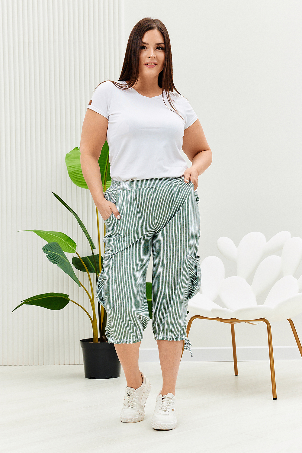 Бриджи прямого силуэта, внизу брюк разрезы и утяжки. На передних частях внутренние карманы и боковые с бантовой складкой. Пояс выполнен на многоигольной машине