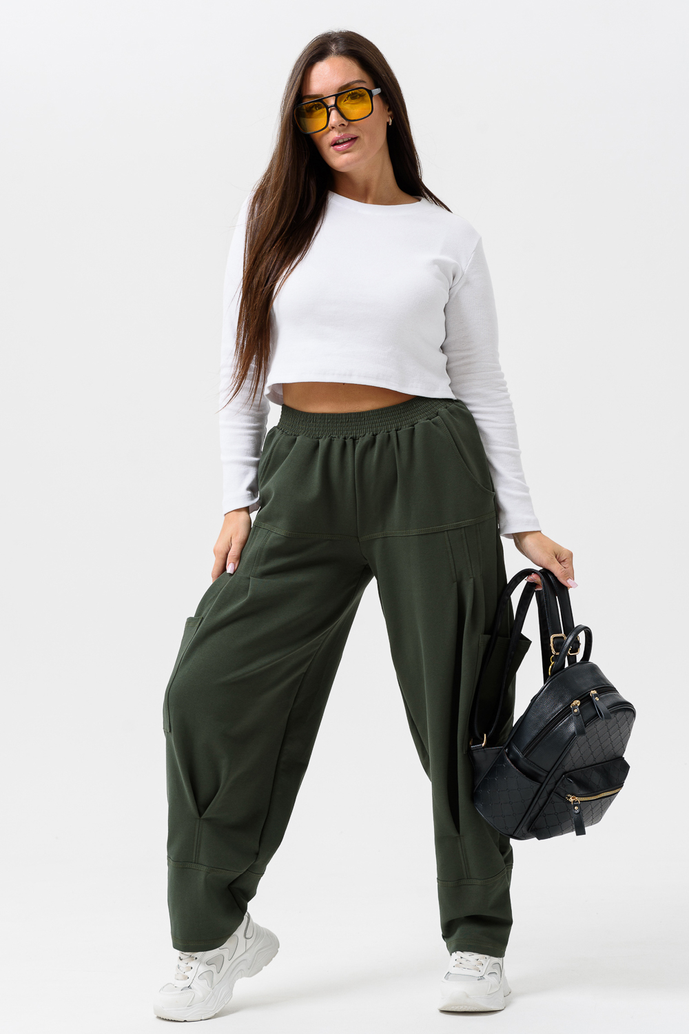 Брюки женские, бананы. Передние и задние части брюк из трех частей. В верхней передней части брюк внутренние карманы. В средней части брюк по три вертикальные складки и по-боковому накладные карманы. Конструкция брюк позволяет скрыть любые недостатки в области бедер.
