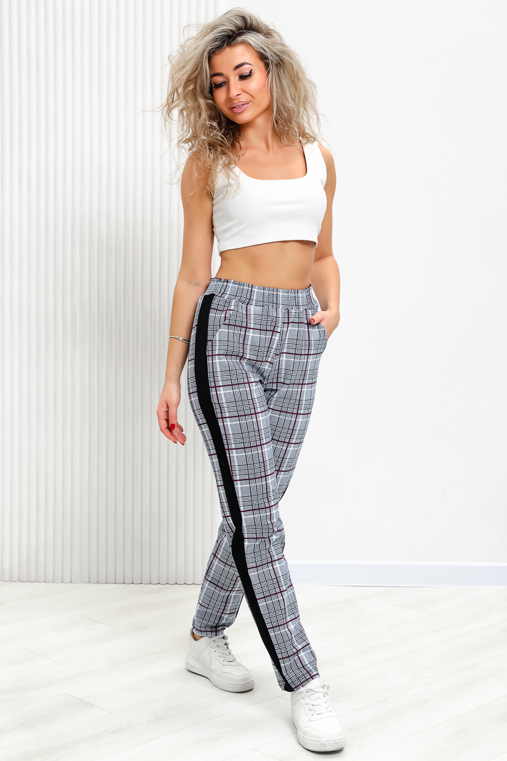 Брюки на эластичном поясе, с боковыми карманами, с лампасами из отделочного полотна вдоль боковых швов.