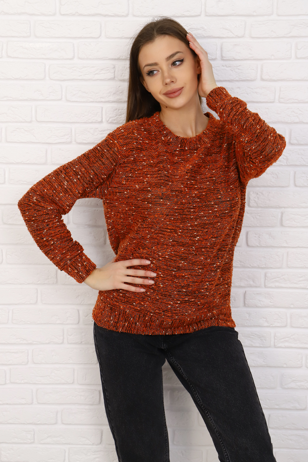 Джемпер женский из мягкого трикотажа букле с цветными вкраплениями. Круглая горловина обработана обтачкой, спущенная пройма, длинный рукав. В плечевом шве имеется силиконовый усилитель. Джемпер свободного покроя, низ и рукава обработаны широким манжетом. Джемпер приятный к телу, не колется.